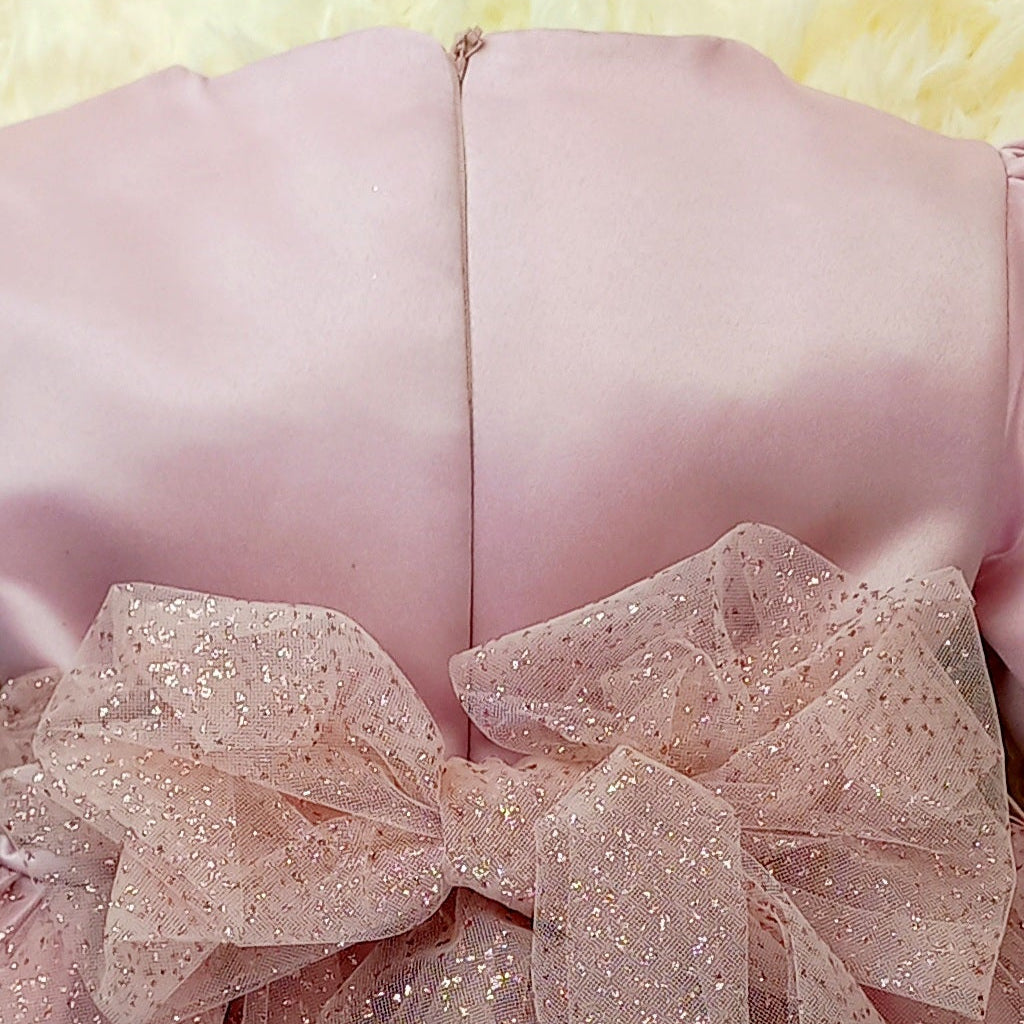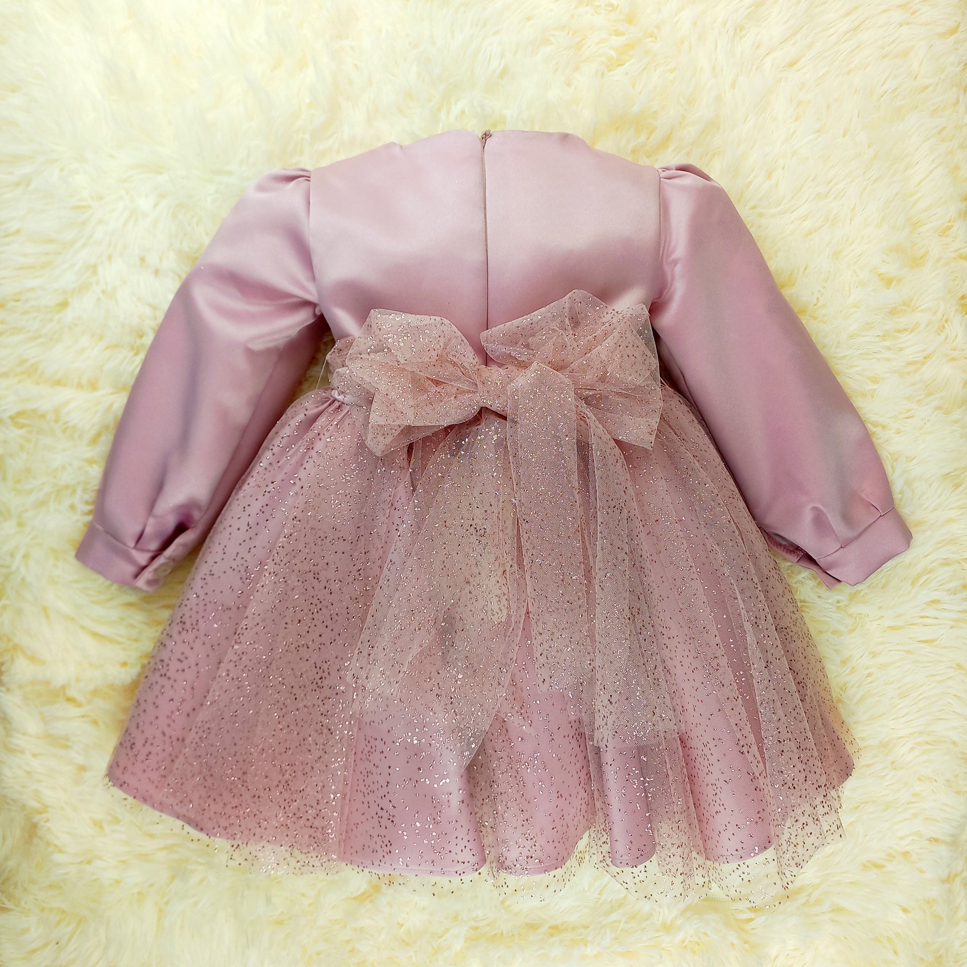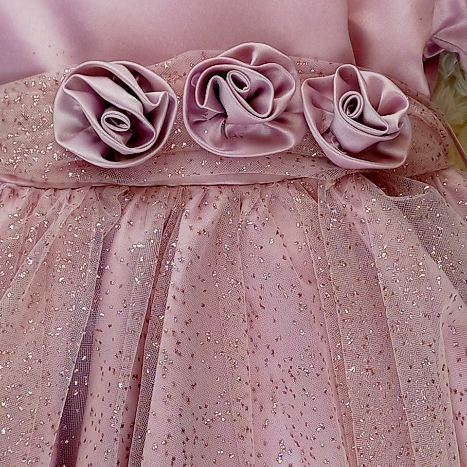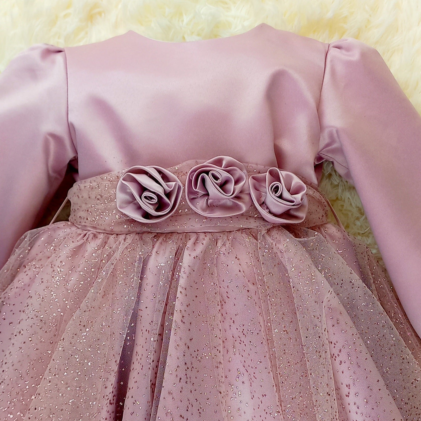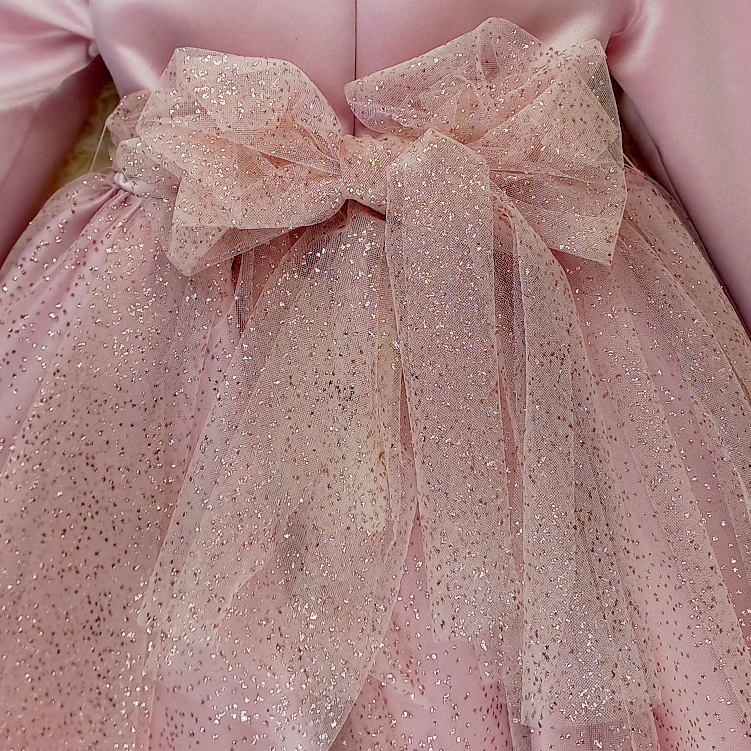 L'abito Ermelinda unisce eleganza e un tocco di magia: corpetto girocollo in raso sposa con maniche lunghe e polsini con bottone, gonna fluida in raso e tulle glitterato che movimenta l'abito. La cintura in tulle glitterato è decorata con fiori in raso ed aggiunge un dettaglio romantico perfetto per brillare nel giorno più speciale. Adatto ad una cerimonia speciale, battesimo oppure primo compleanno.