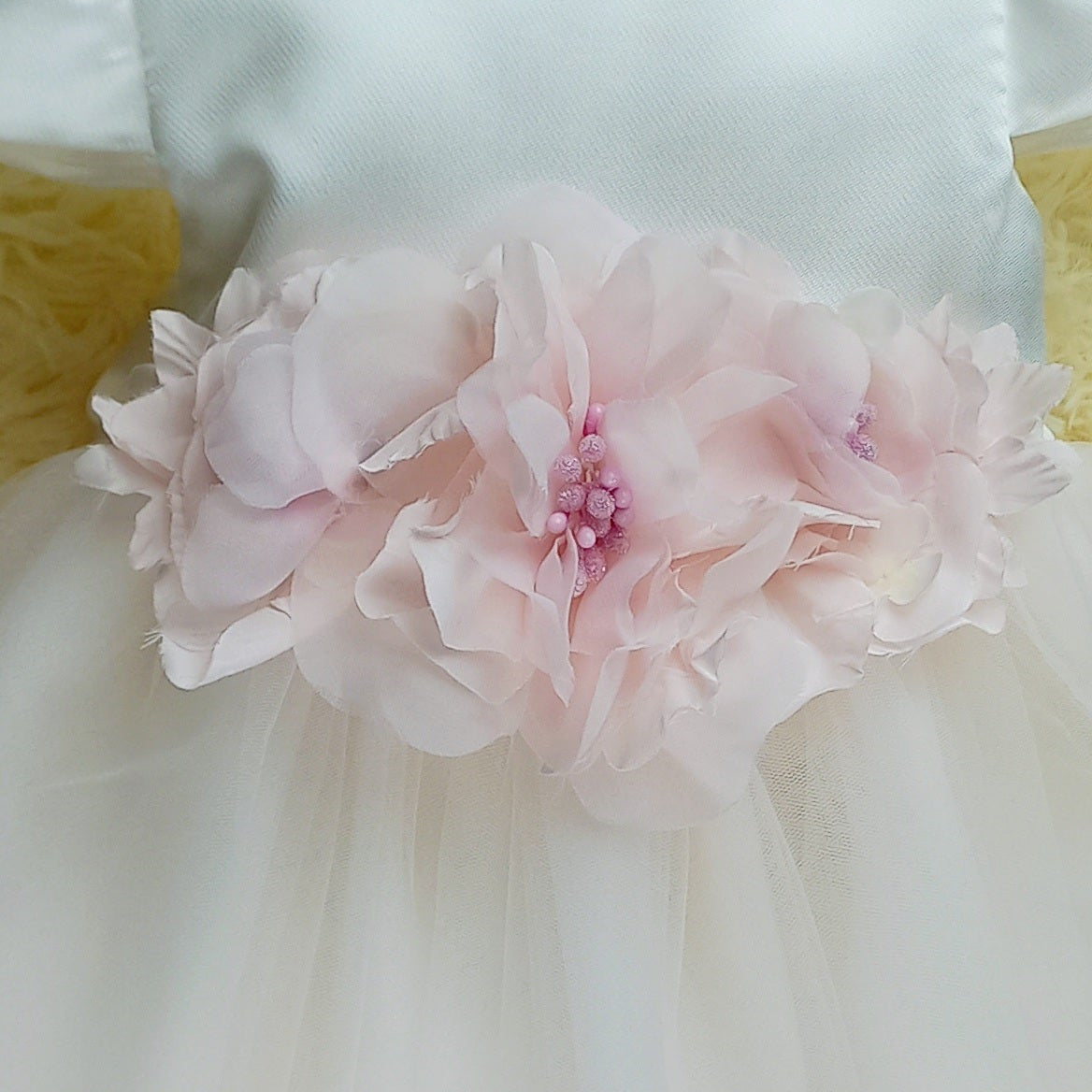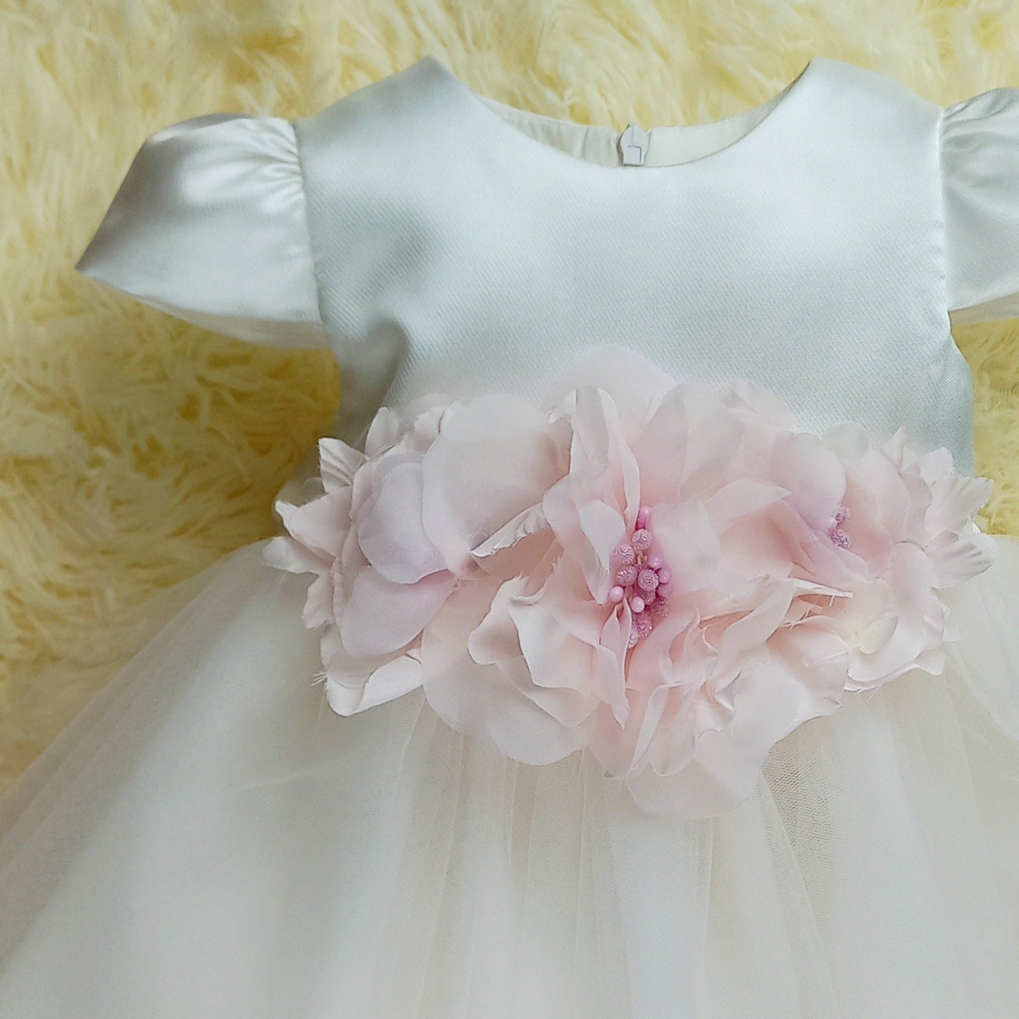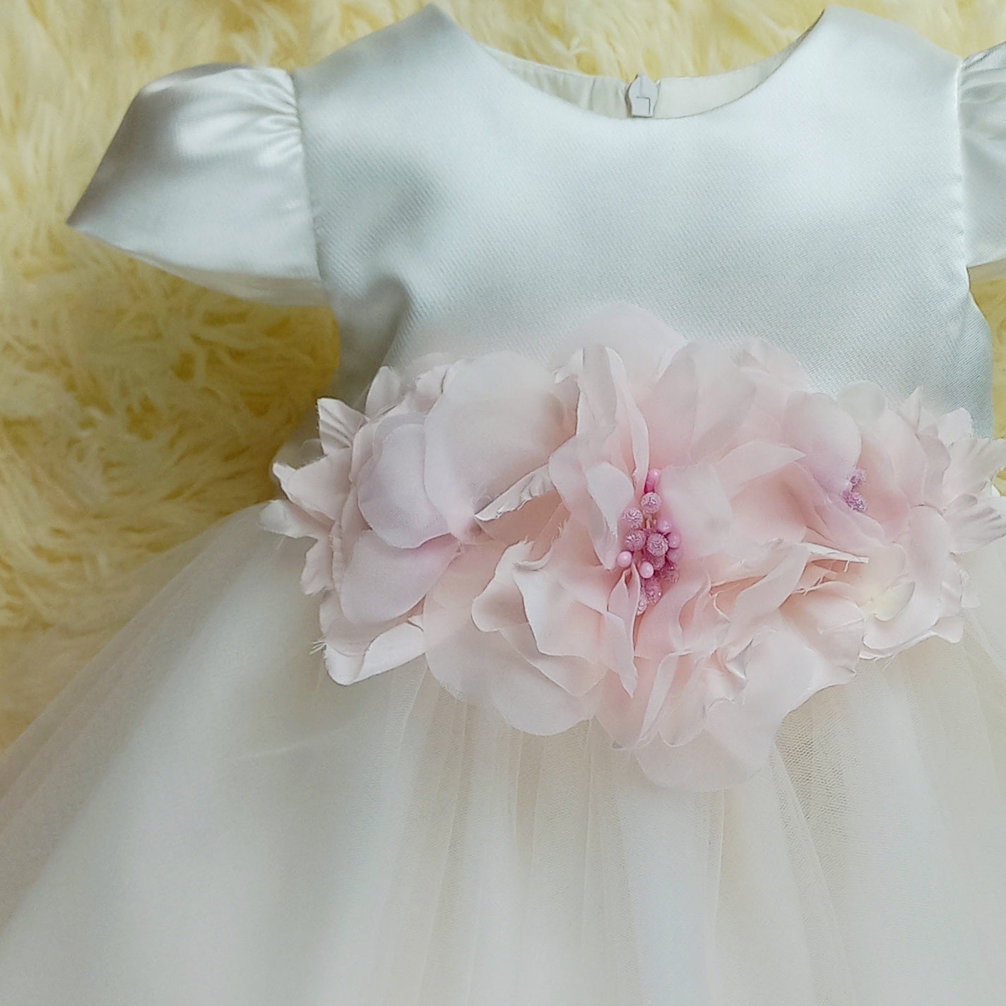 L'abito Felicita unisce la raffinatezza del mikado con la leggerezza del tulle, creando un look delicato ed elegante. Il corpetto in mikado è arricchito da una piccola manichetta, mentre la gonna in tulle sfumata rosa dona un tocco di ricercatezza. La fascia finale in mikado e la spilla a fiore rosa in vita aggiungono dettagli femminili, completati da un fiocco posteriore che rende l’abito perfetto per i momenti più speciali. Perfetto per il battesimo, per una cerimonia importante o per il primo compleanno.