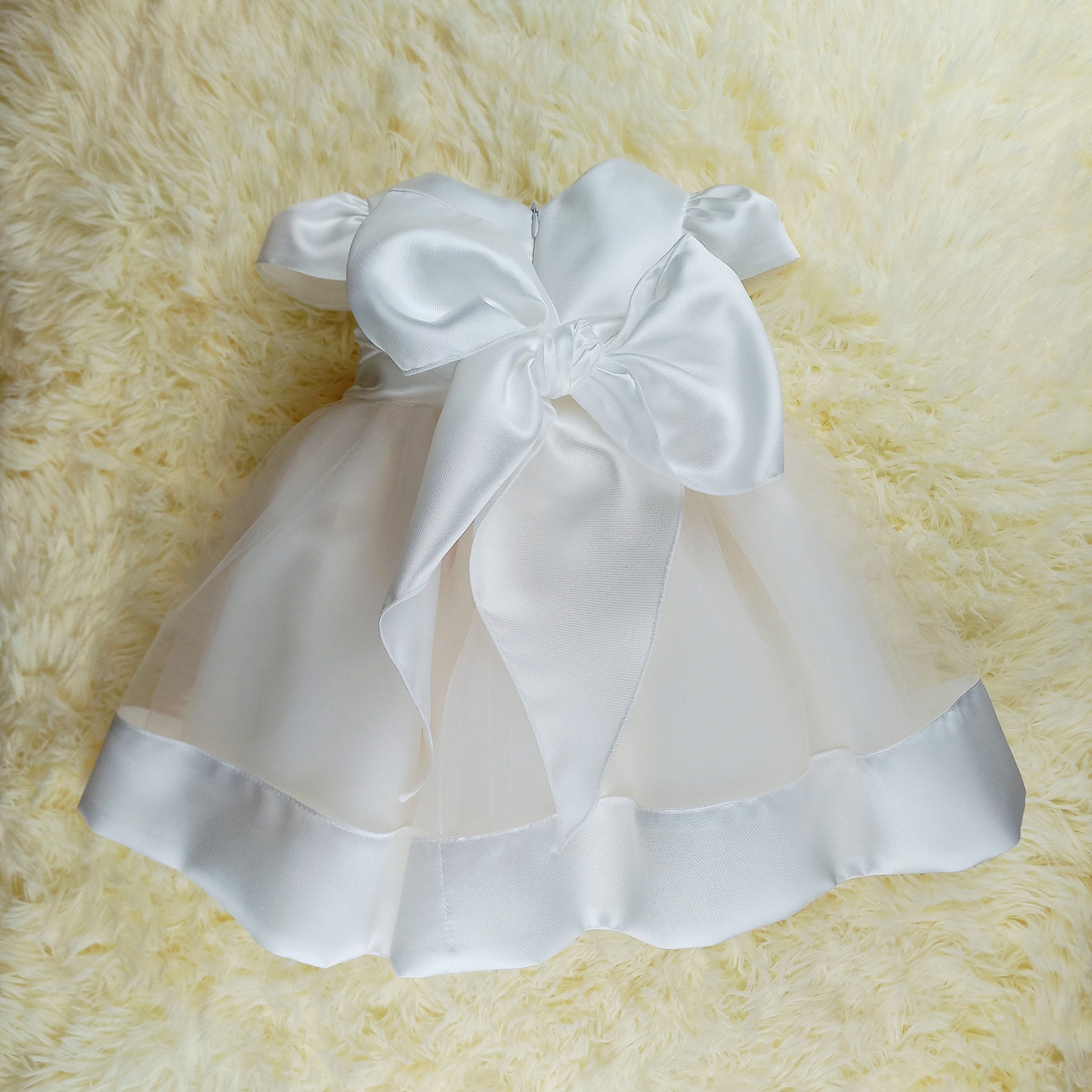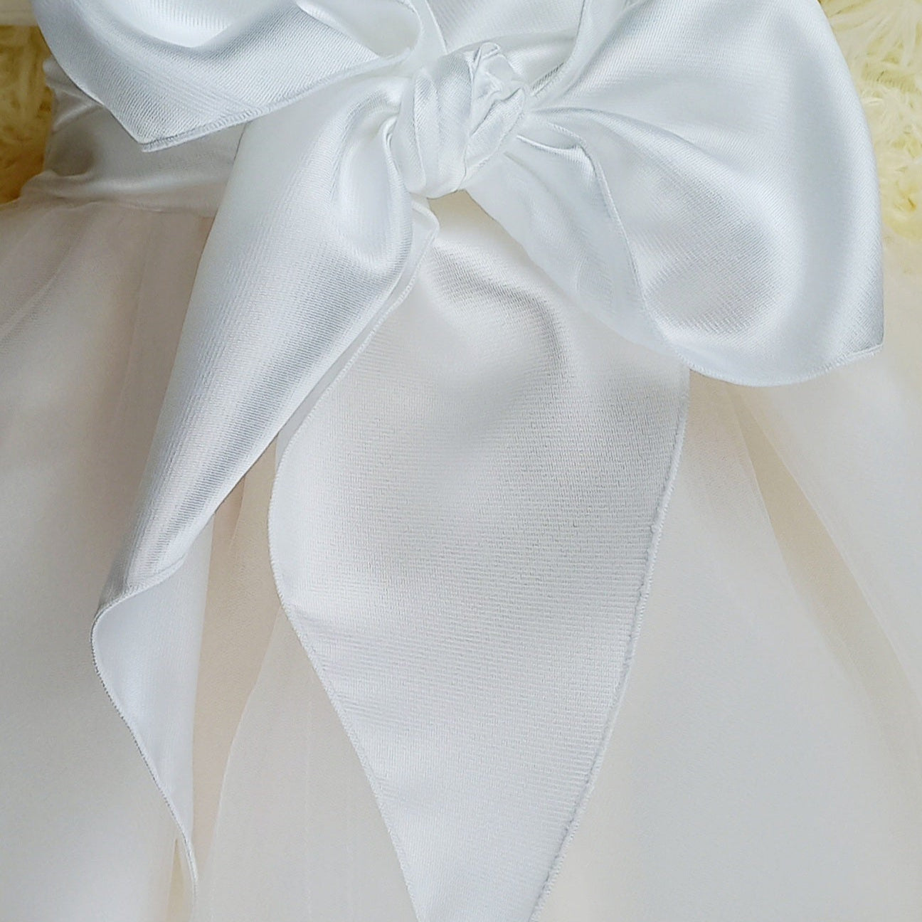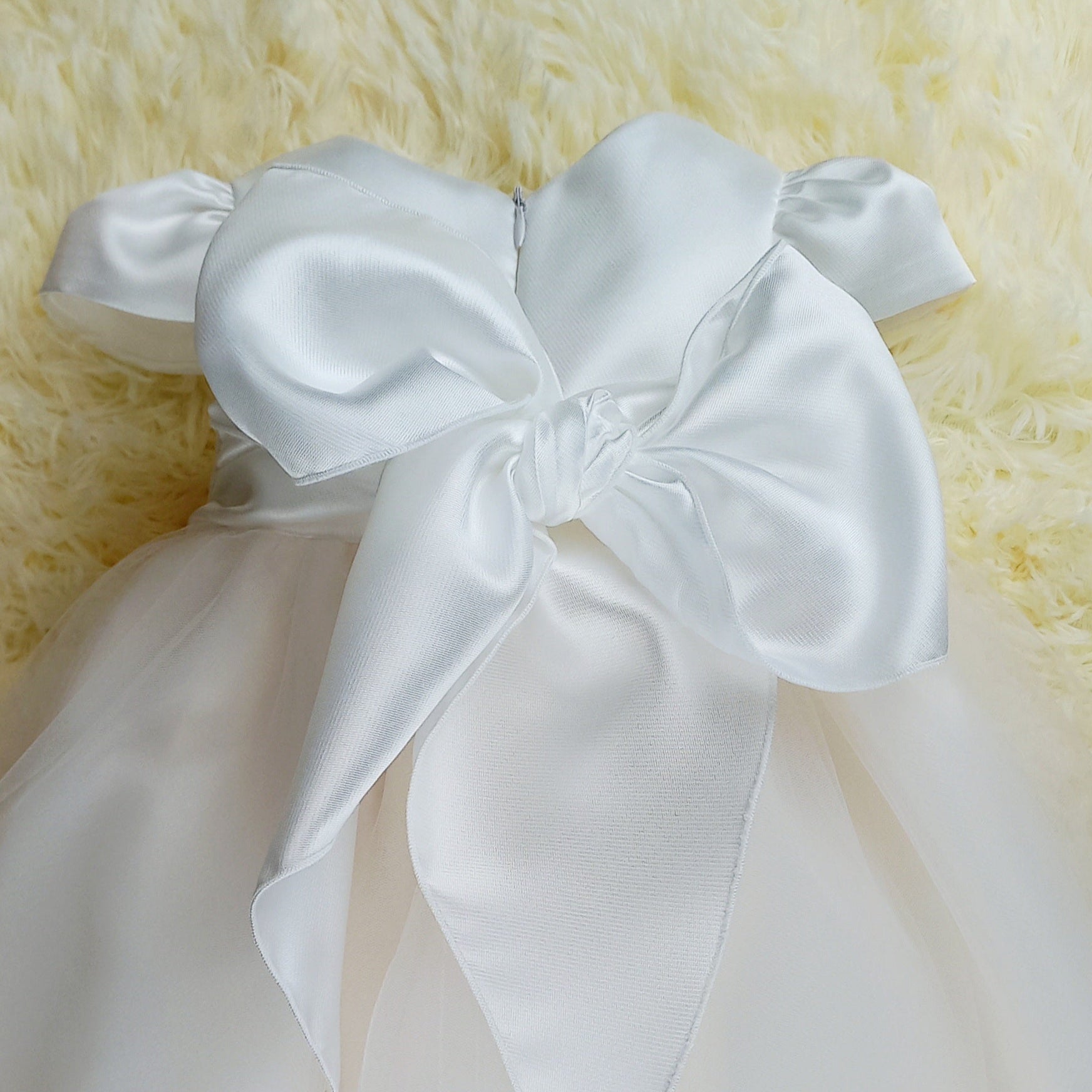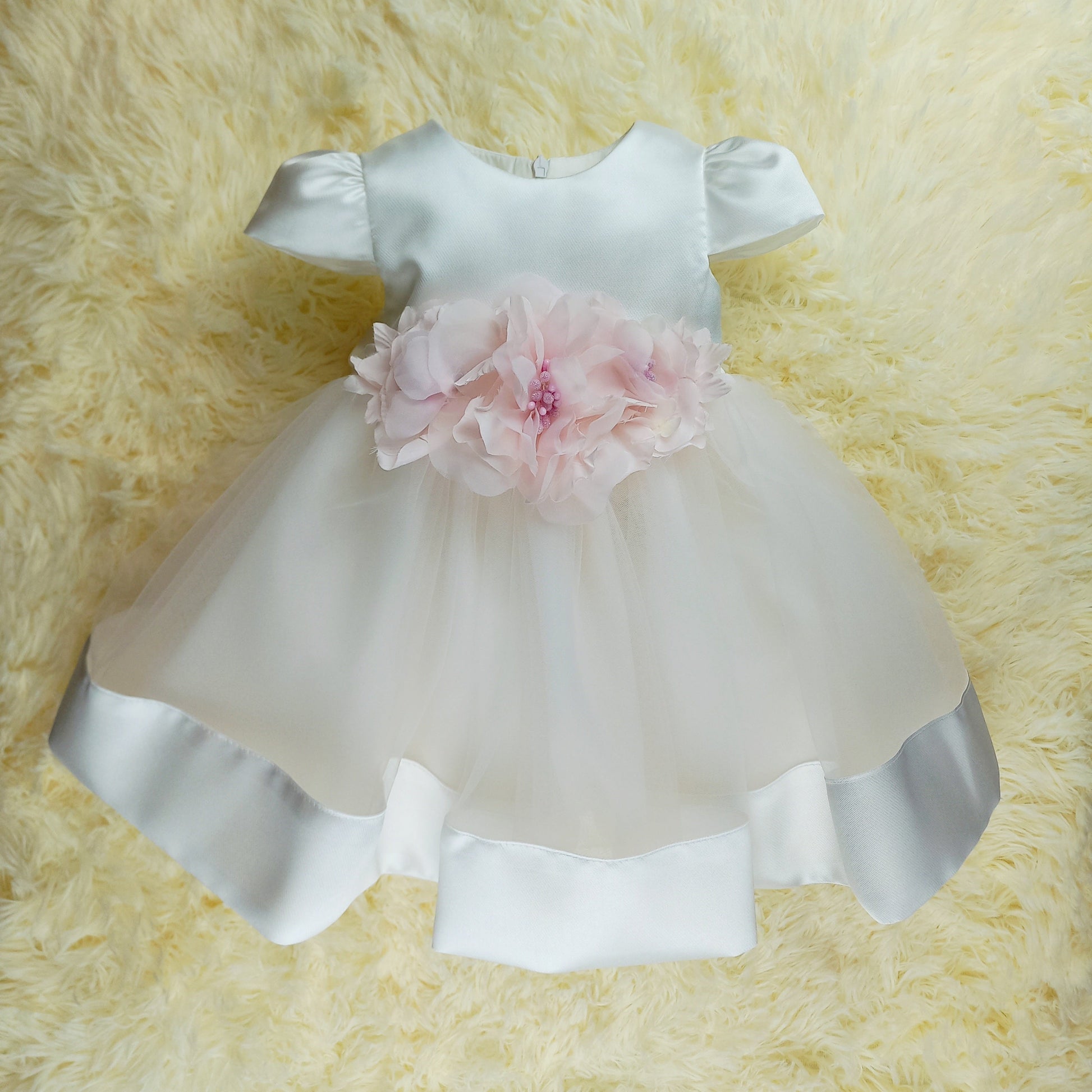 L'abito Felicita unisce la raffinatezza del mikado con la leggerezza del tulle, creando un look delicato ed elegante. Il corpetto in mikado è arricchito da una piccola manichetta, mentre la gonna in tulle sfumata rosa dona un tocco di ricercatezza. La fascia finale in mikado e la spilla a fiore rosa in vita aggiungono dettagli femminili, completati da un fiocco posteriore che rende l’abito perfetto per i momenti più speciali. Perfetto per il battesimo, per una cerimonia importante o per il primo compleanno.