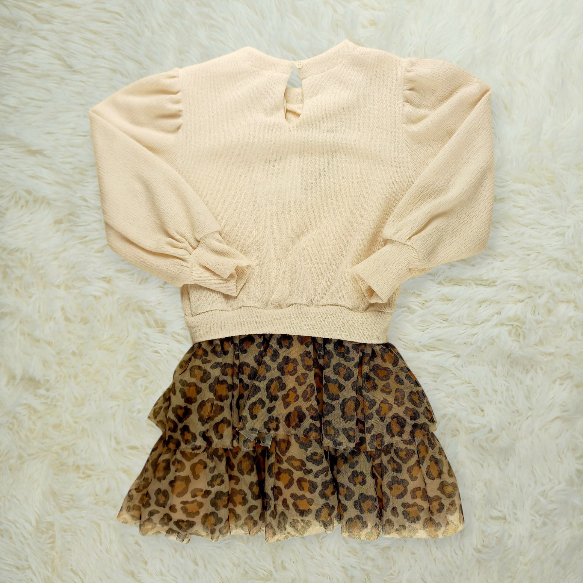 L'abito Manuela unisce il calore del cotone alla leggerezza del tulle, decorato con balze maculate che aggiungono un tocco modaiolo. Il cuore in eco pelliccia sul petto dona dolcezza e carattere, mentre la chiusura a goccia sul retro completa il look con un dettaglio raffinato. Perfetto per uno stile glamour ed elegante.