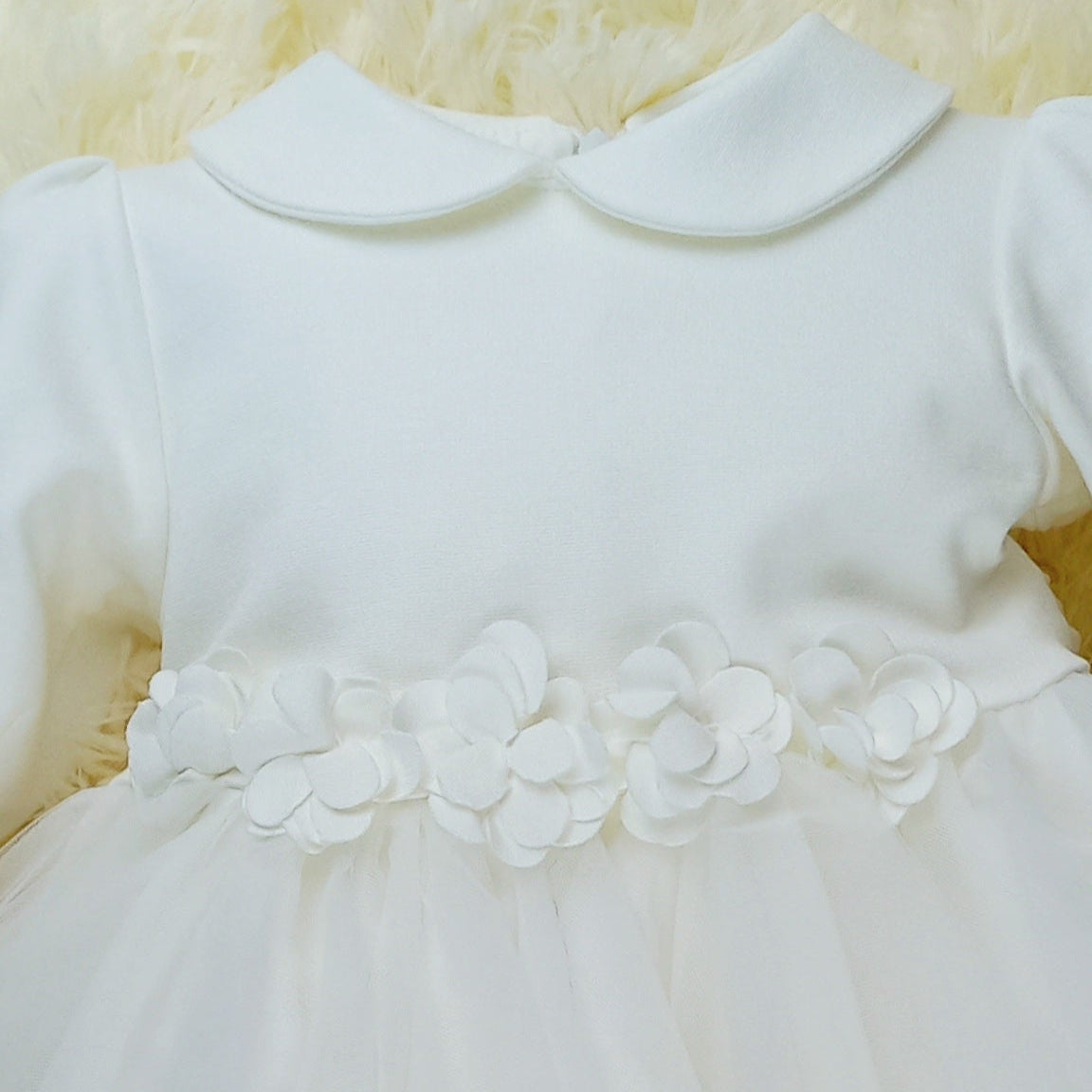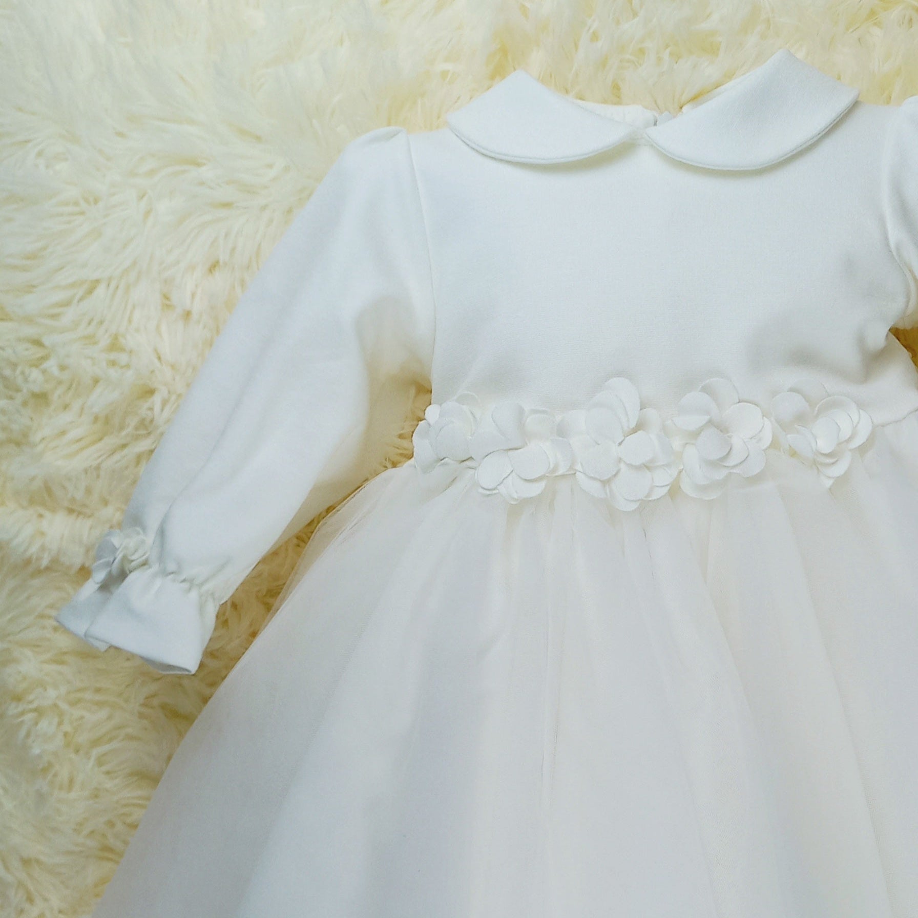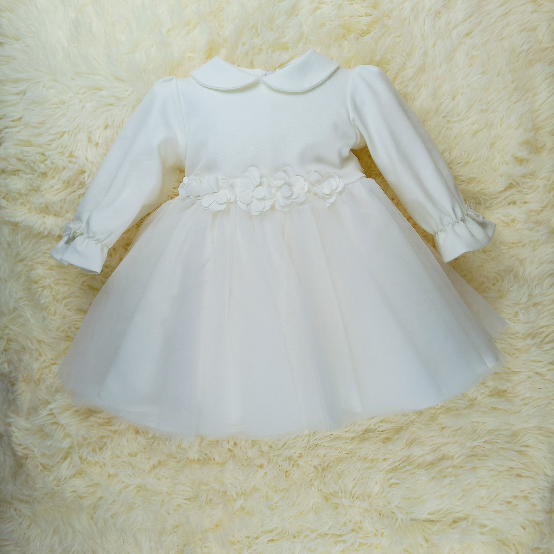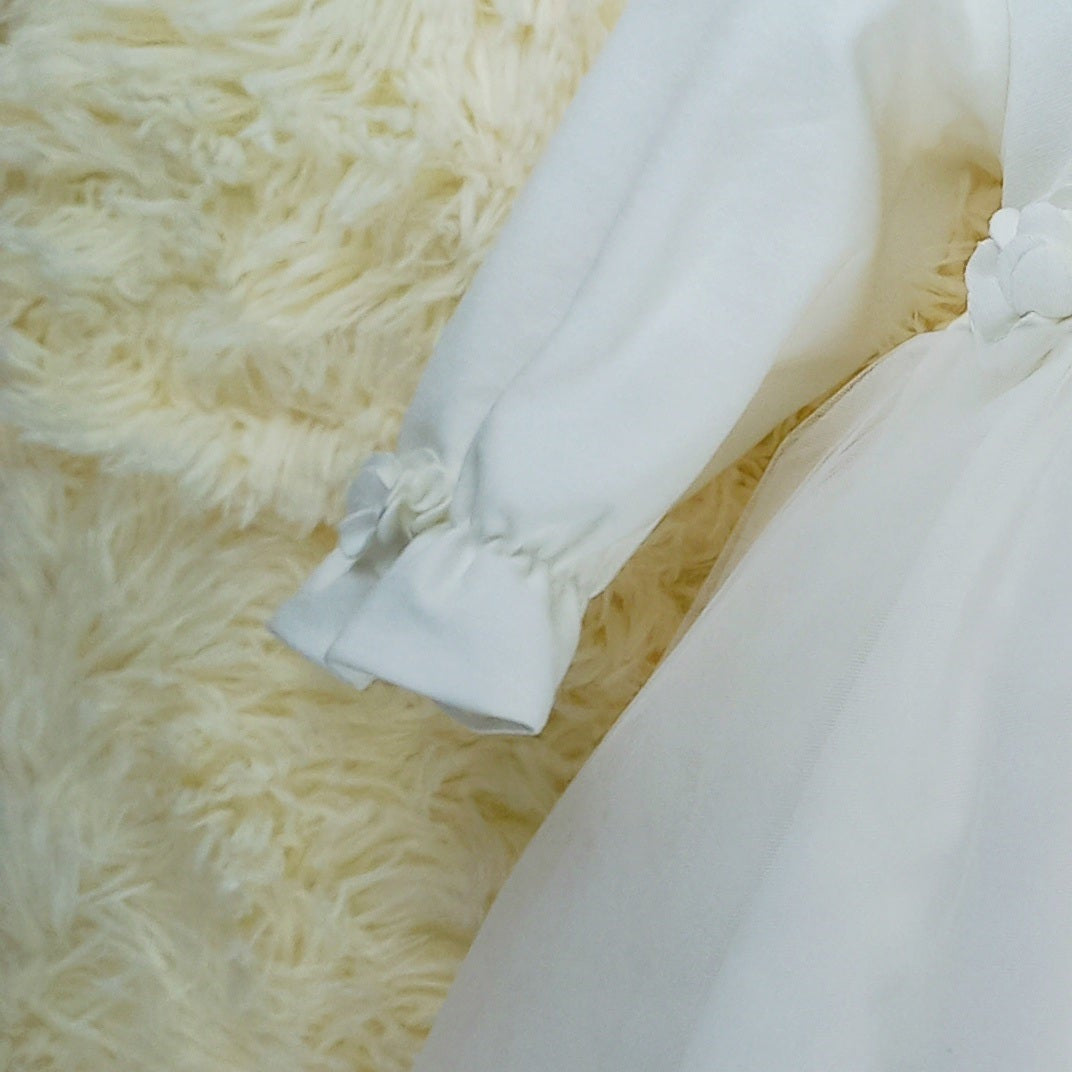 L'abito Matilde unisce la delicatezza del punto milano al tulle: il colletto e le maniche lunghe arricciate al polso donano un fascino romantico, mentre i fiorellini applicati aggiungono un dettaglio elegante. La gonna in tulle, arricchita da fiori applicati in vita, completa un look leggero e sognante, perfetto per il battesimo o il primo compleanno.