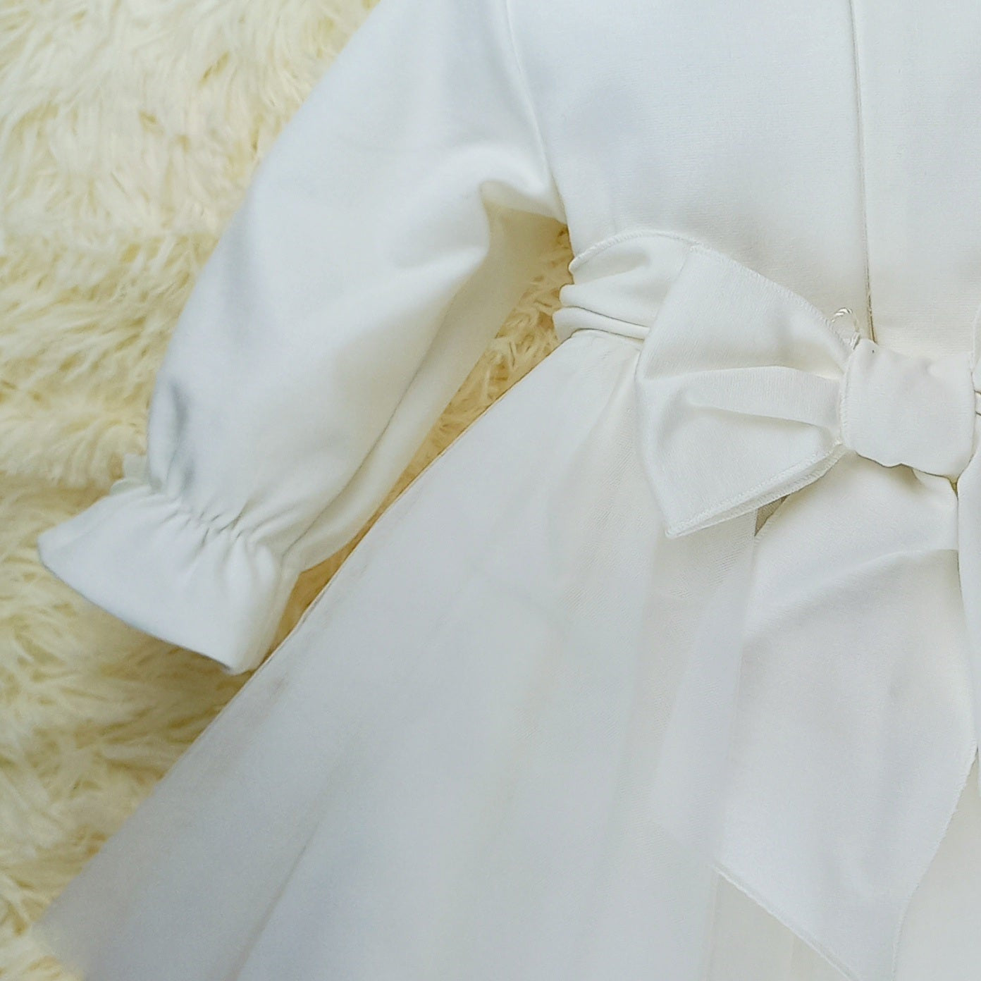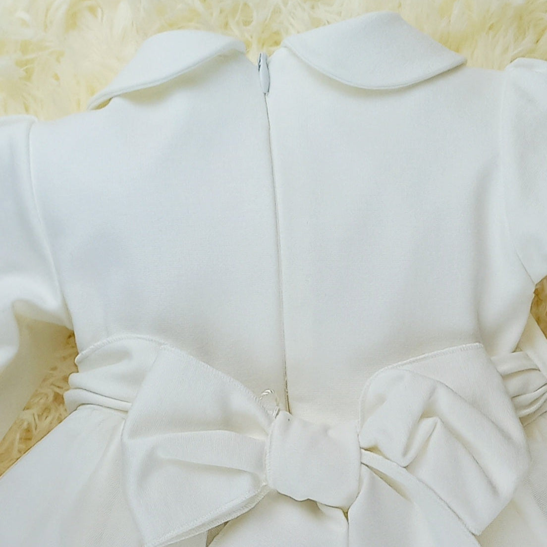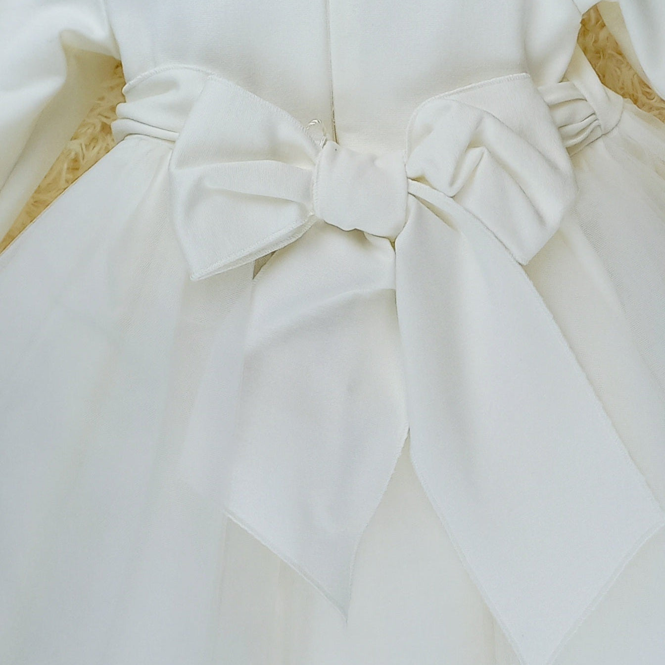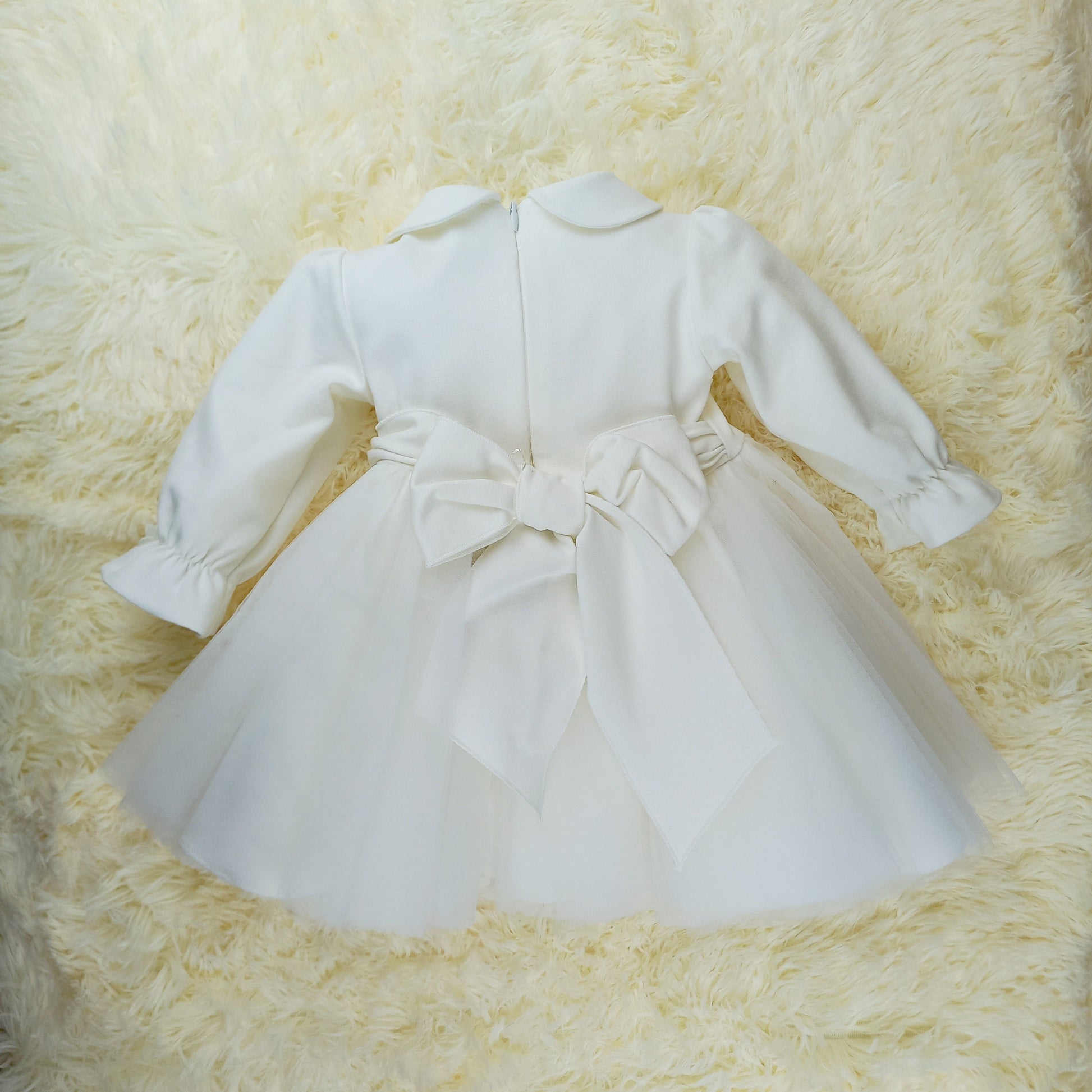 L'abito Matilde unisce la delicatezza del punto milano al tulle: il colletto e le maniche lunghe arricciate al polso donano un fascino romantico, mentre i fiorellini applicati aggiungono un dettaglio elegante. La gonna in tulle, arricchita da fiori applicati in vita, completa un look leggero e sognante, perfetto per il battesimo o il primo compleanno.