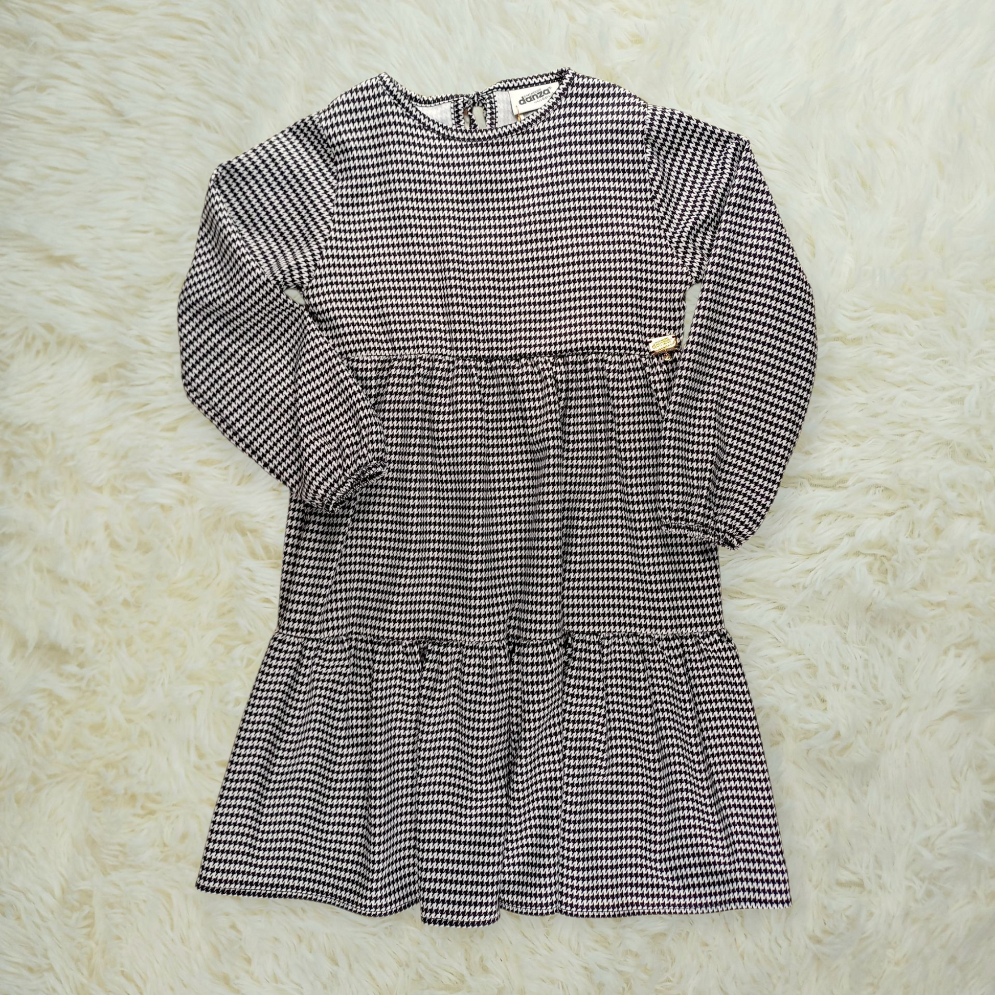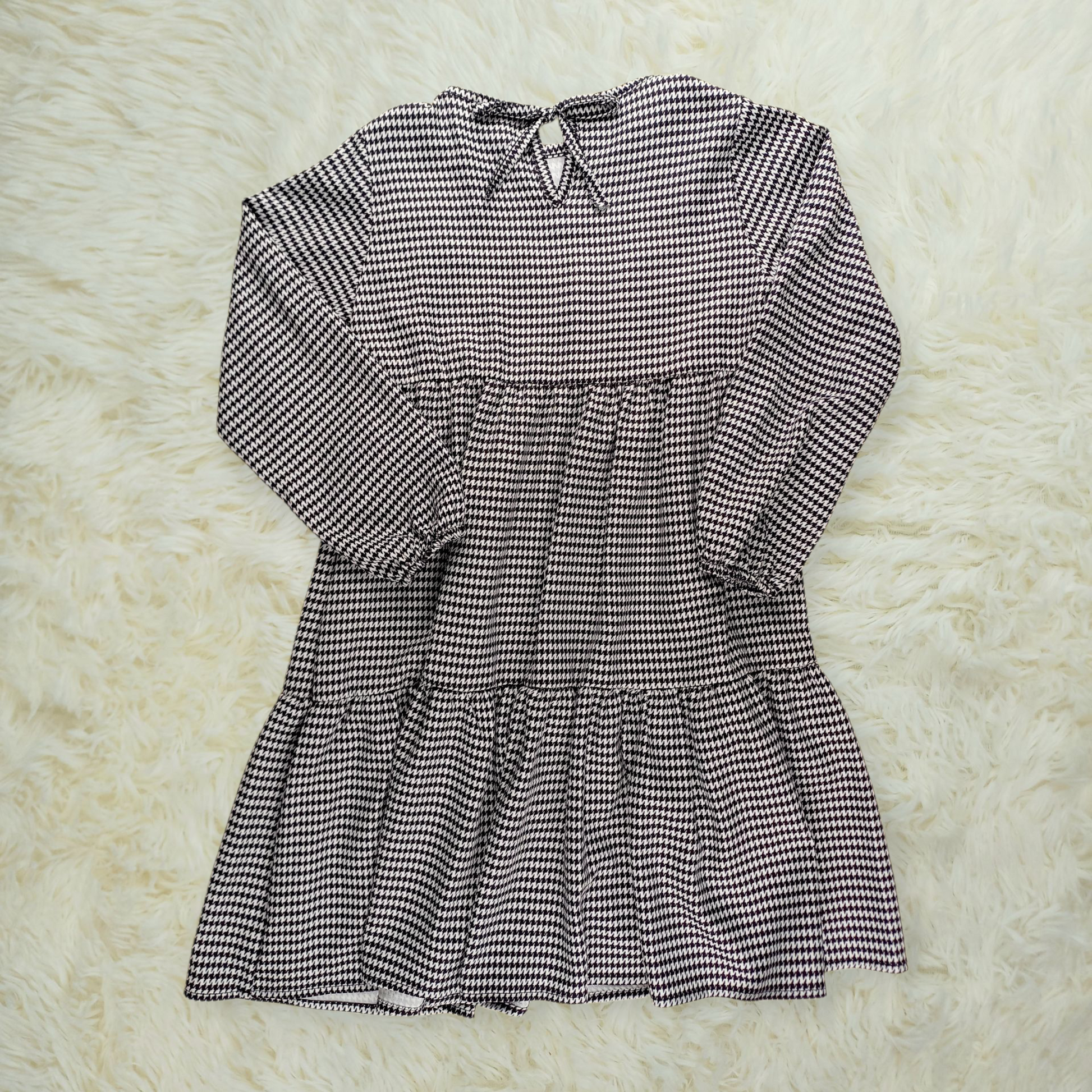 L’abito Paoletta in morbida maglina presenta una fantasia pied poule che dona un tocco chic. La chiusura sul retro a goccia aggiunge un dettaglio raffinato, mentre l’elastico sui polsi garantisce comfort e libertà di movimento. La balza finale completa il look con un vezzo femminile e leggero, perfetto per ogni occasione.