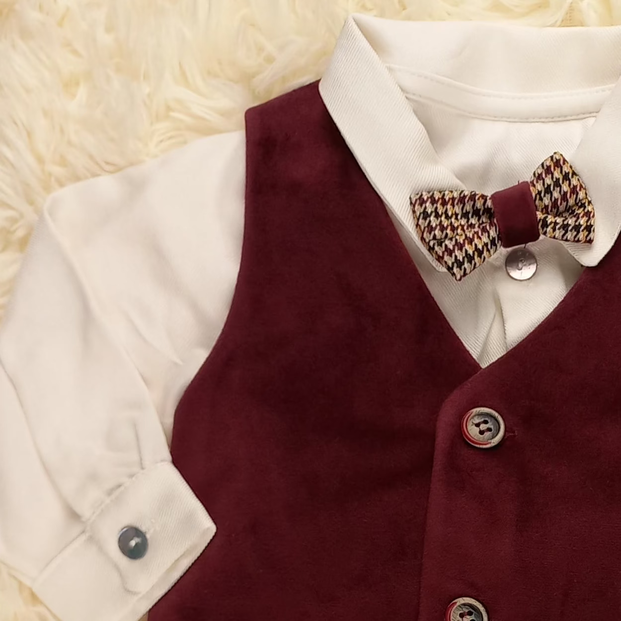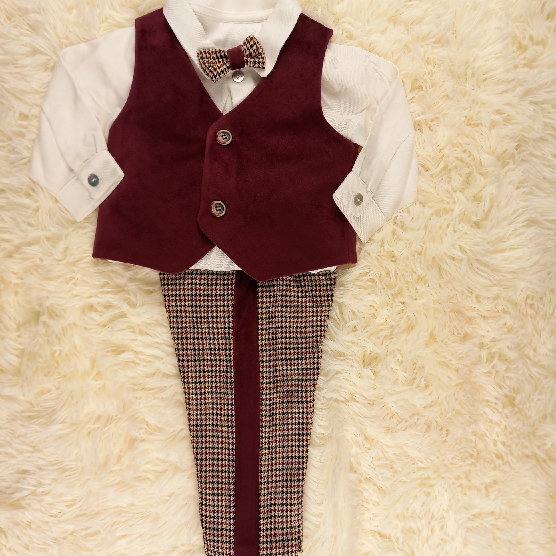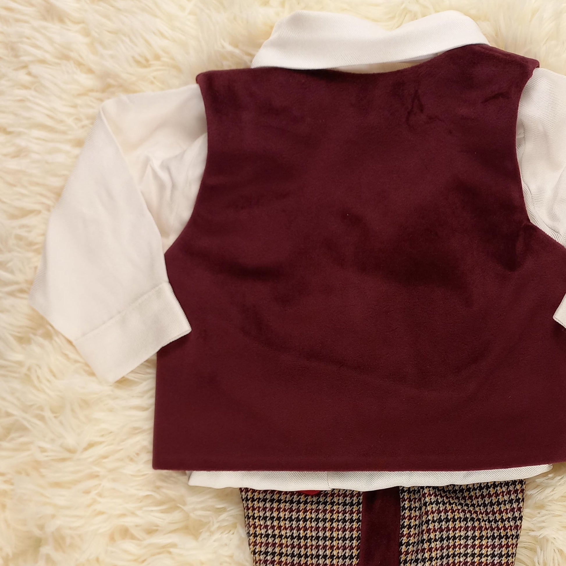 Eleganza sofisticata per il piccolo gentleman! Il completo Carlos è la scelta perfetta per occasioni speciali. Camicia in morbida flanella, pantalone micro scozzese con dettagli in velluto gilet in velluto coordinato e papillon abbinato completano un look raffinato e divertente. Ogni pezzo è pensato per valorizzare lo stile del tuo bambino con comfort e personalità. Un completo che trasforma ogni momento in un'occasione da ricordare!