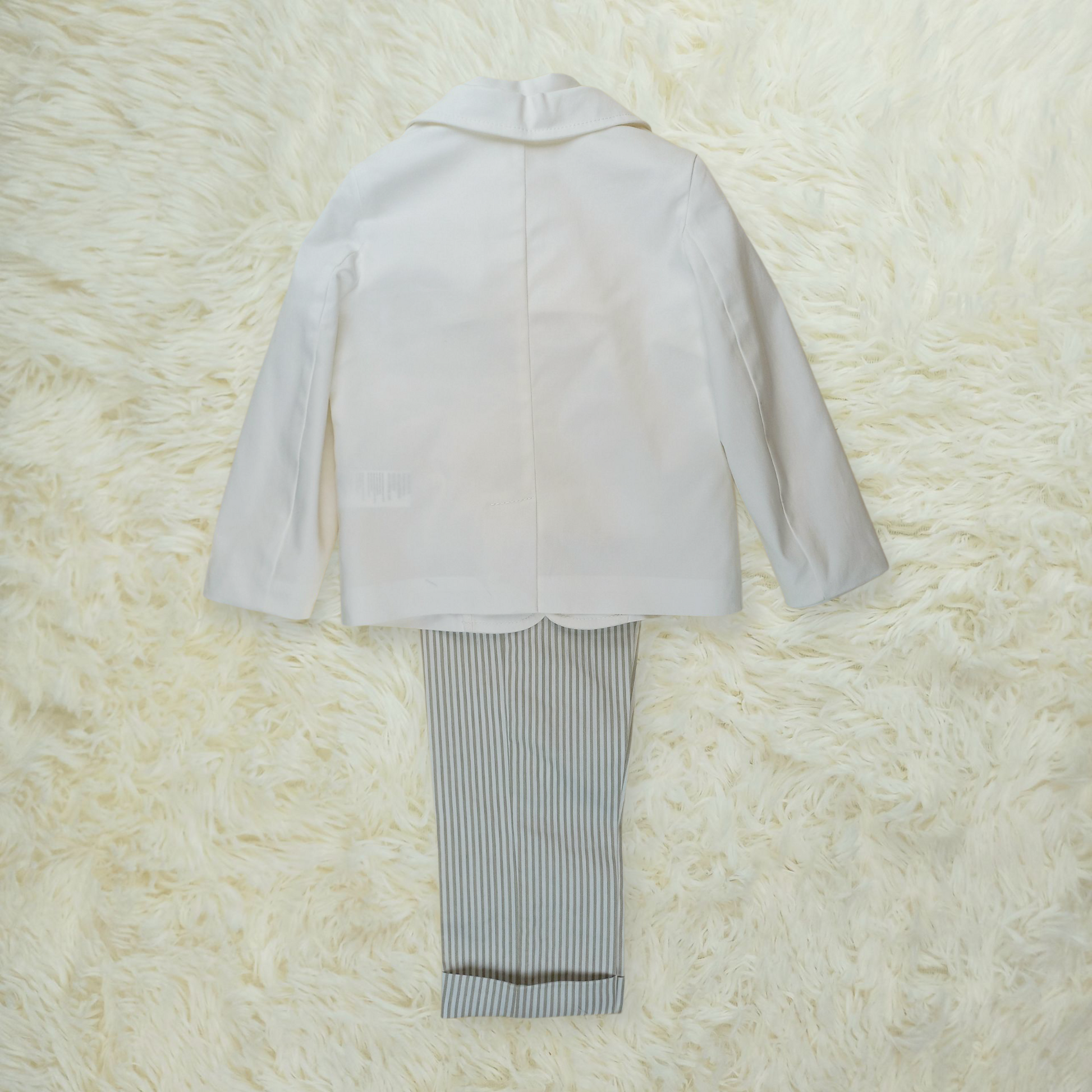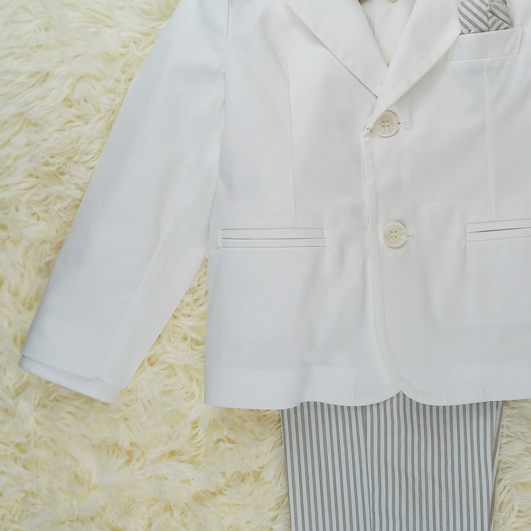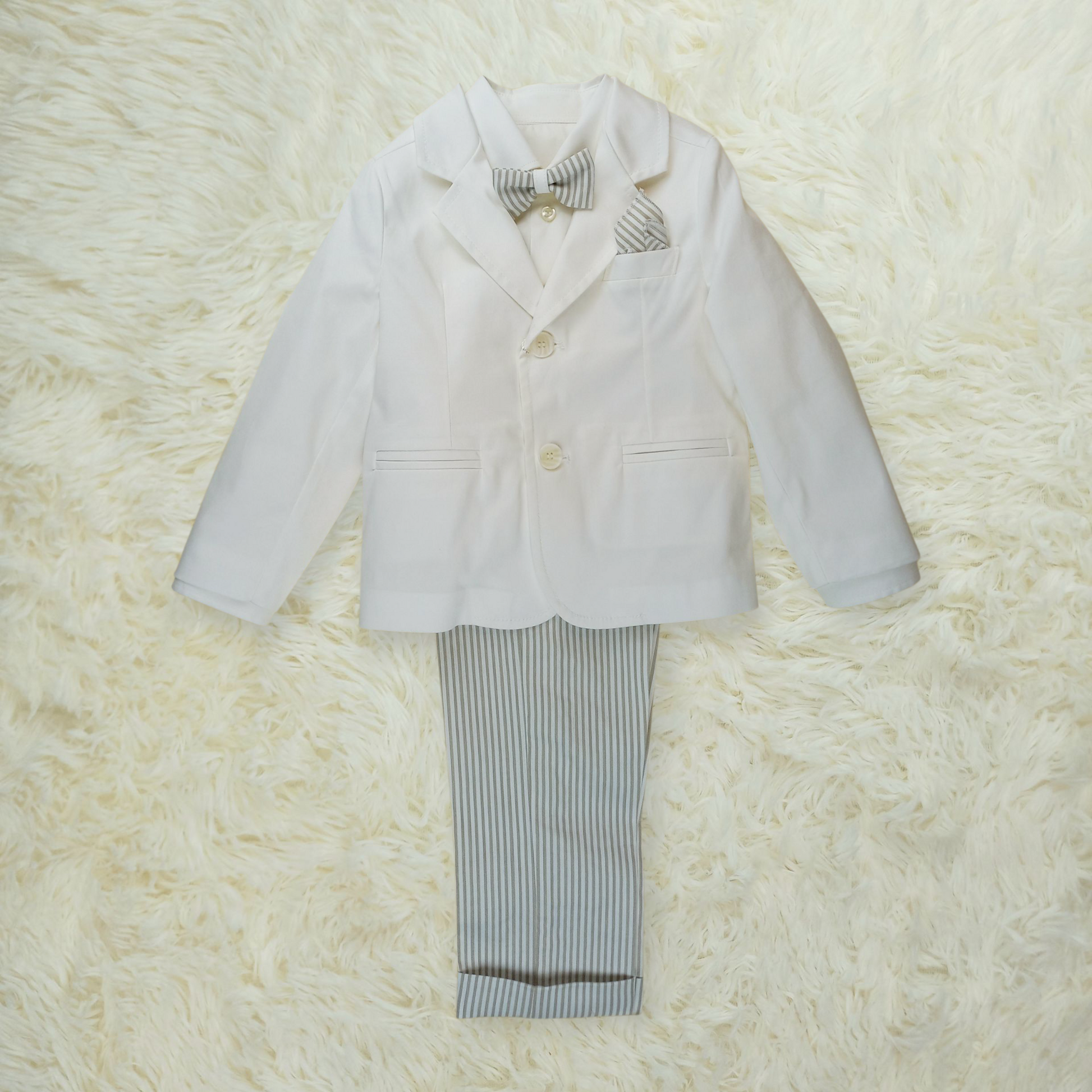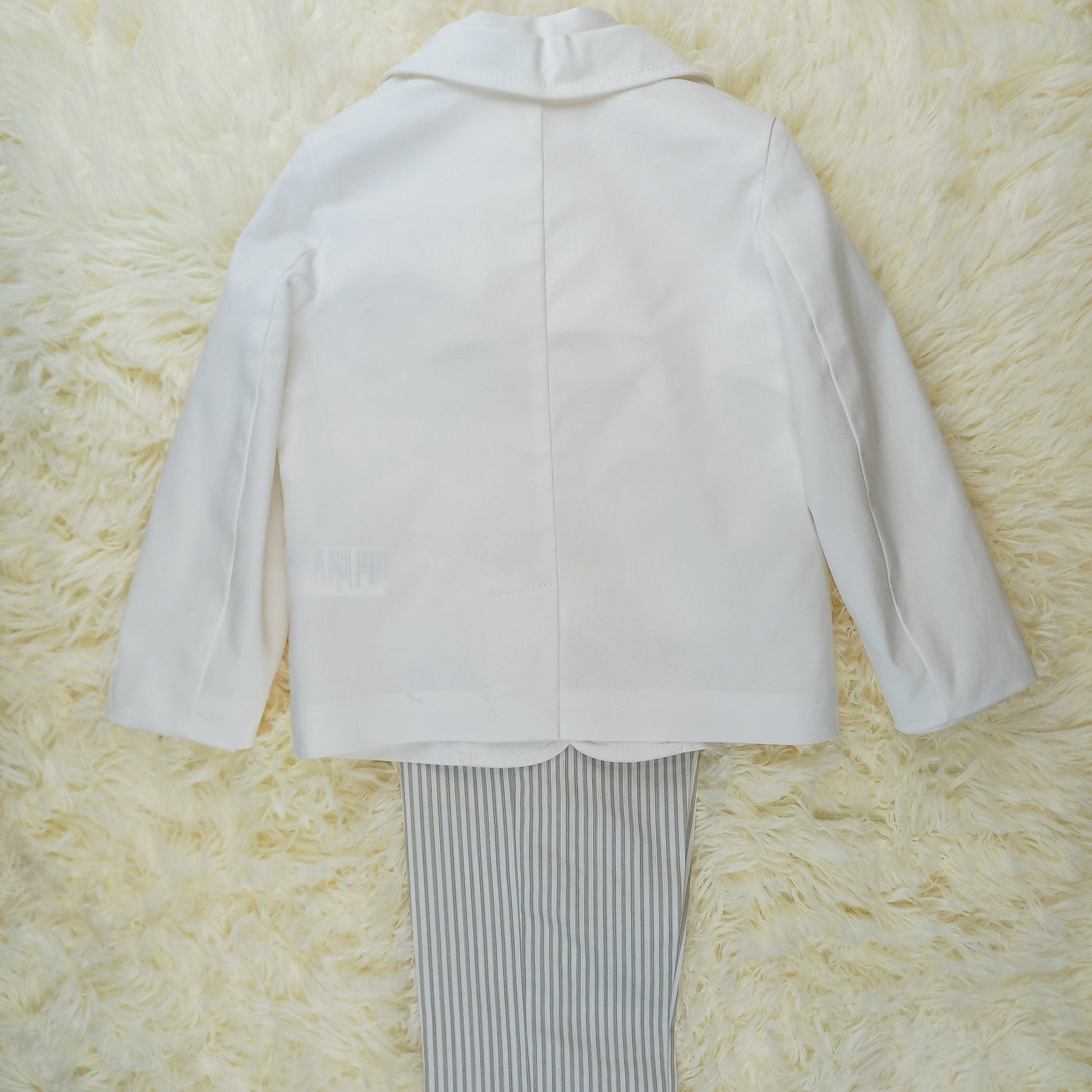 Il completo Gastone è il perfetto mix di eleganza e allegria per le occasioni speciali. Questo set in 5 pezzi comprende la camicia in cotone fresca e confortevole, la giacca a tinta unita e i pantaloni gessati nei delicati toni del panna e beige, abbinati al papillon e alla pochette coordinata. Scegli il completo Gastone per un look raffinato adatto sia per il battesimo che per il primo compleanno.