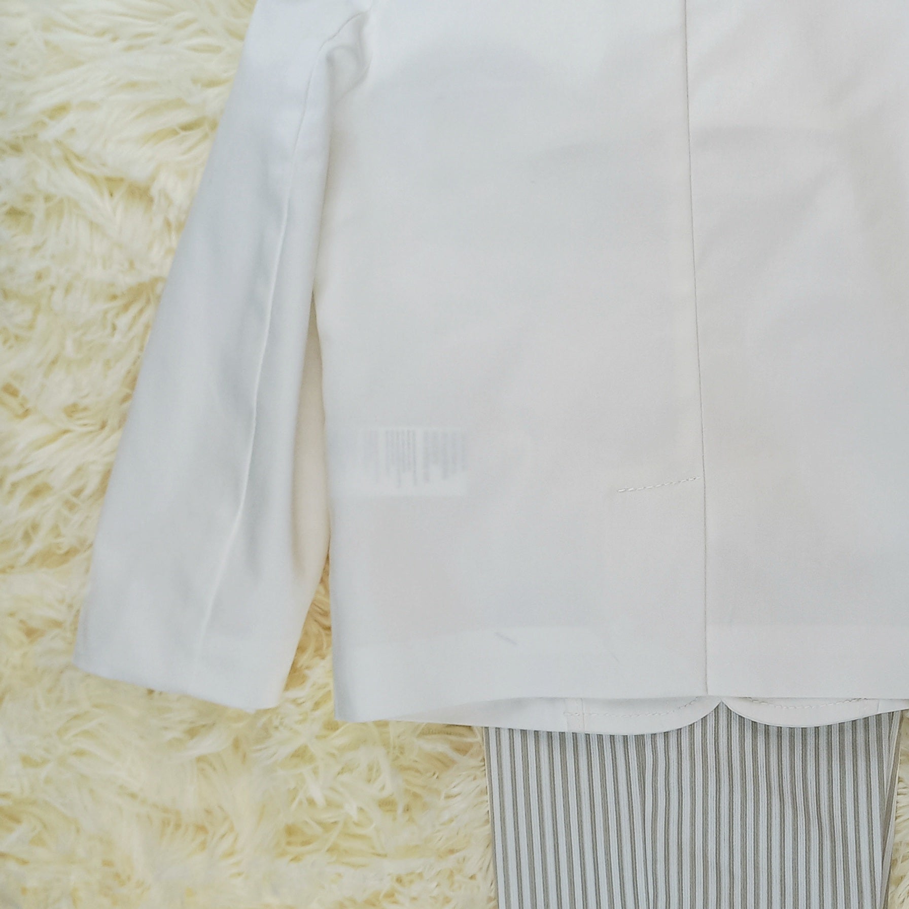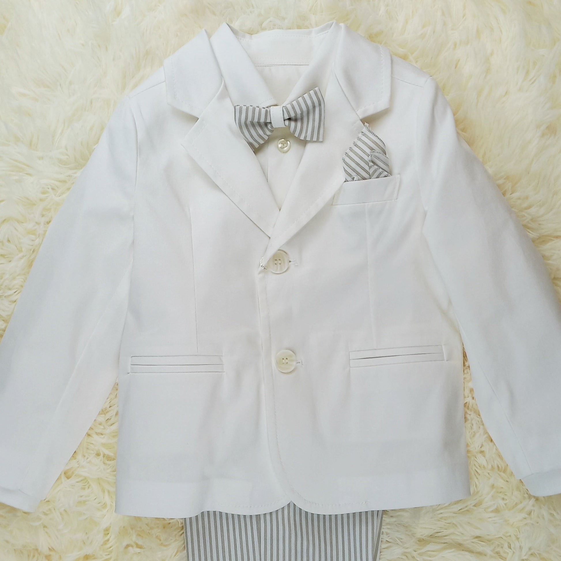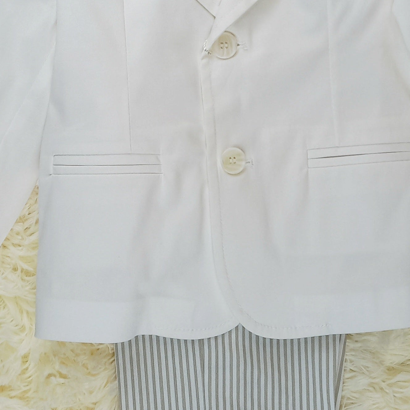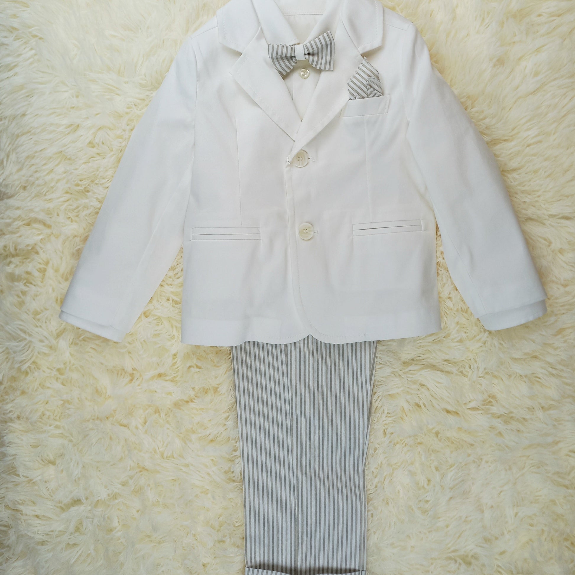 Il completo Gastone è il perfetto mix di eleganza e allegria per le occasioni speciali. Questo set in 5 pezzi comprende la camicia in cotone fresca e confortevole, la giacca a tinta unita e i pantaloni gessati nei delicati toni del panna e beige, abbinati al papillon e alla pochette coordinata. Scegli il completo Gastone per un look raffinato adatto sia per il battesimo che per il primo compleanno.