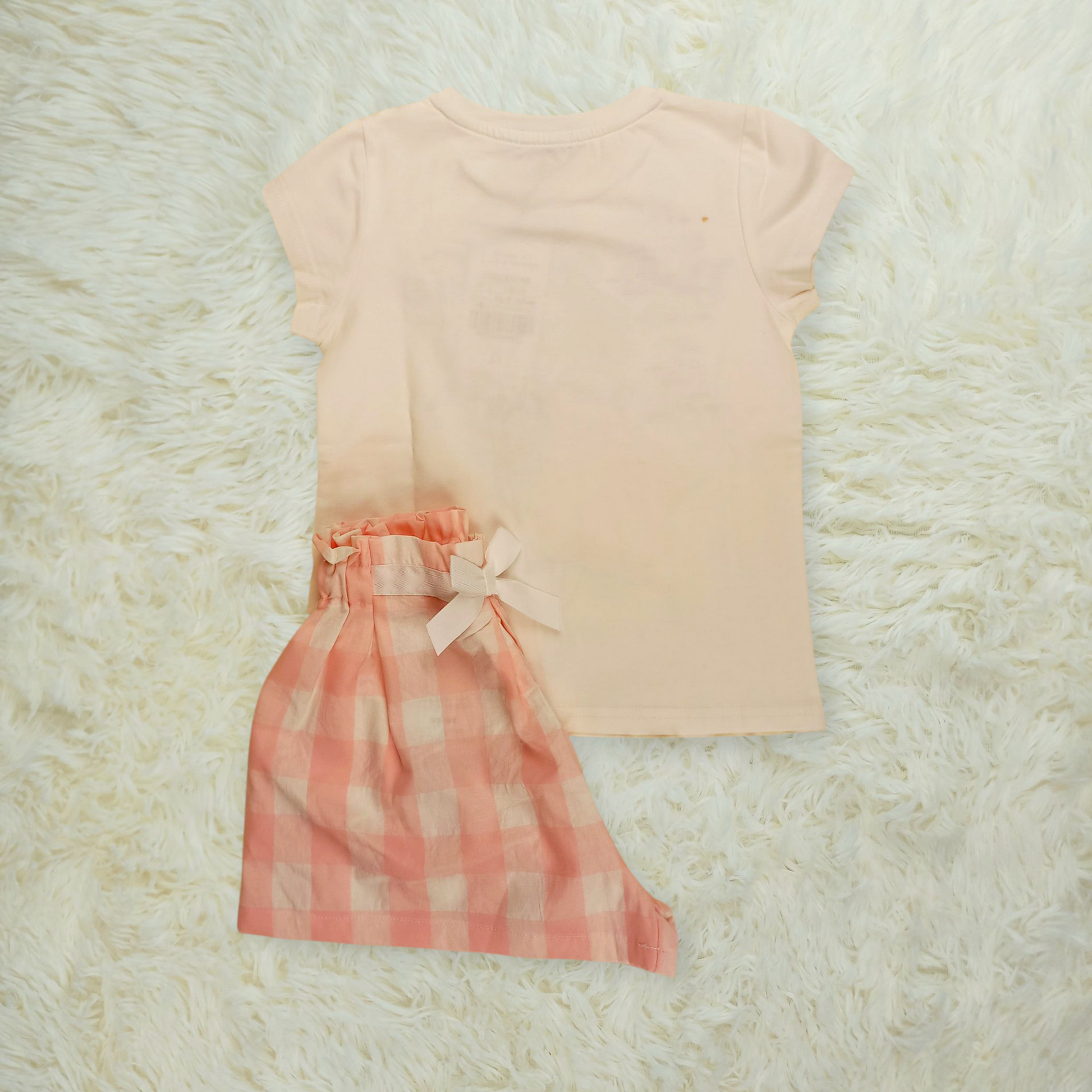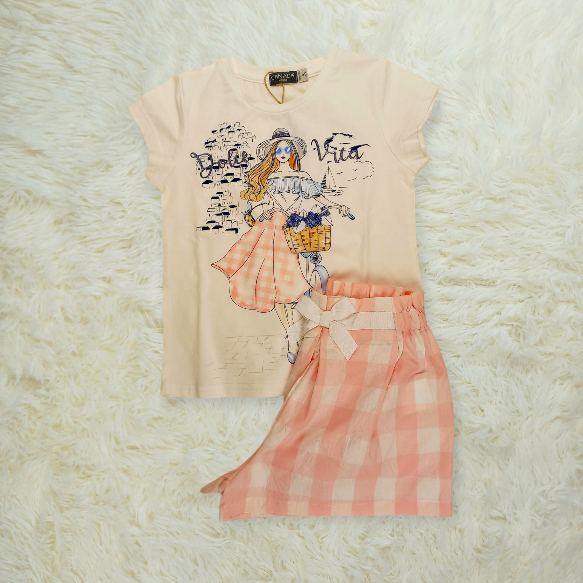 Il completo Gloria unisce una maglietta in morbido cotone con vestibilità regolare al bermuda in tela di cotone a caramella, perfetti per muoversi con leggerezza e stile. L’elastico in vita con fiocchetto applicato aggiunge un tocco sfizioso e comodo, ideale per giornate spensierate all’aria aperta. Un outfit fresco e divertente che non rinuncia al comfort!