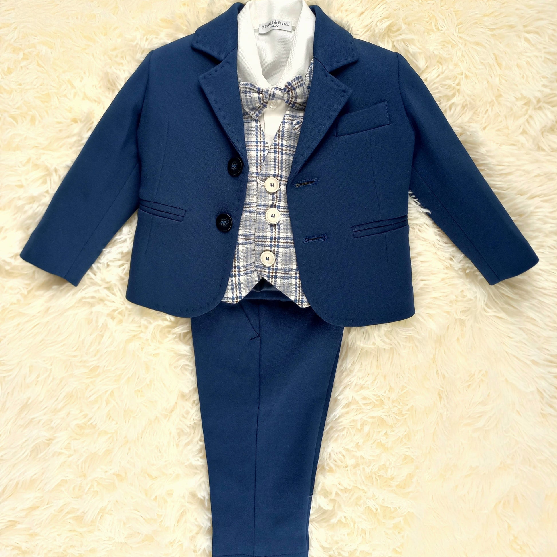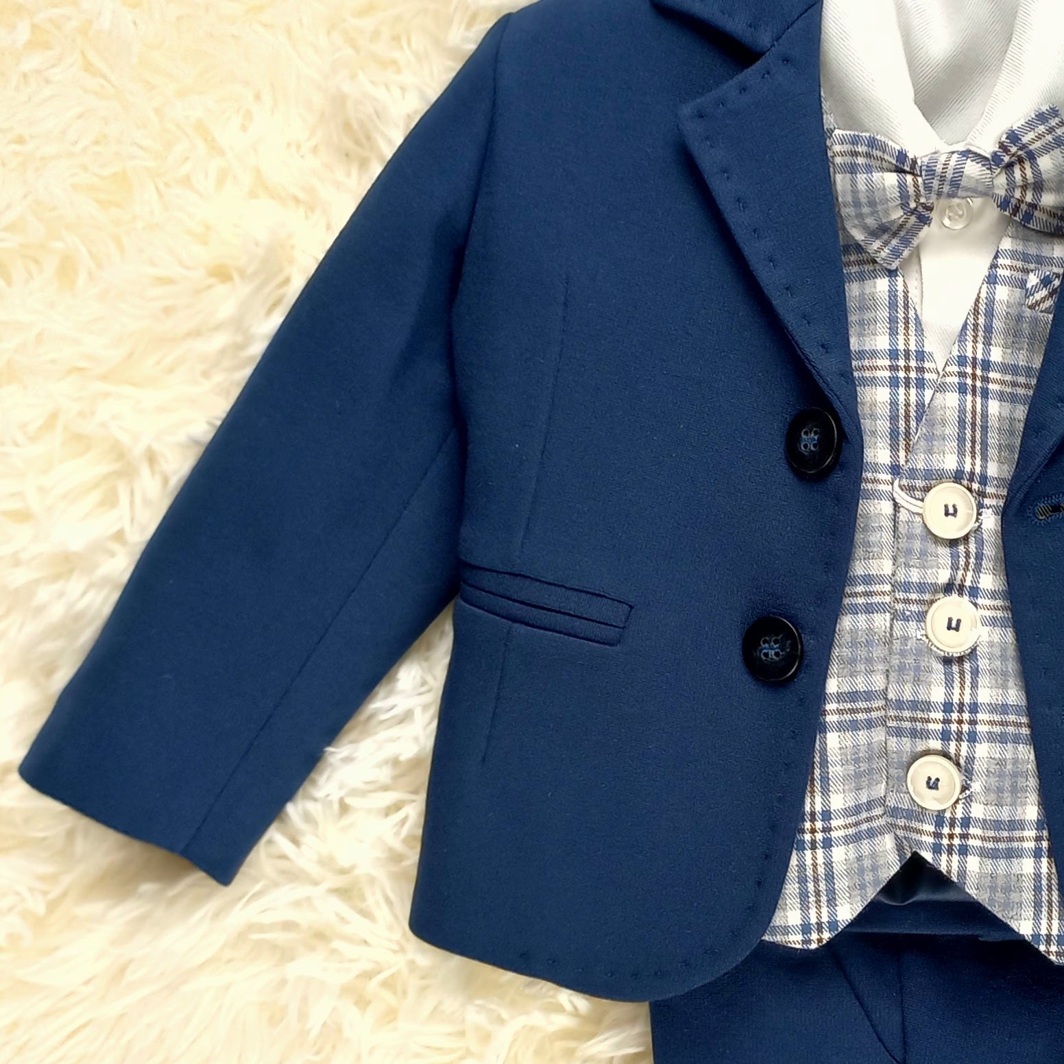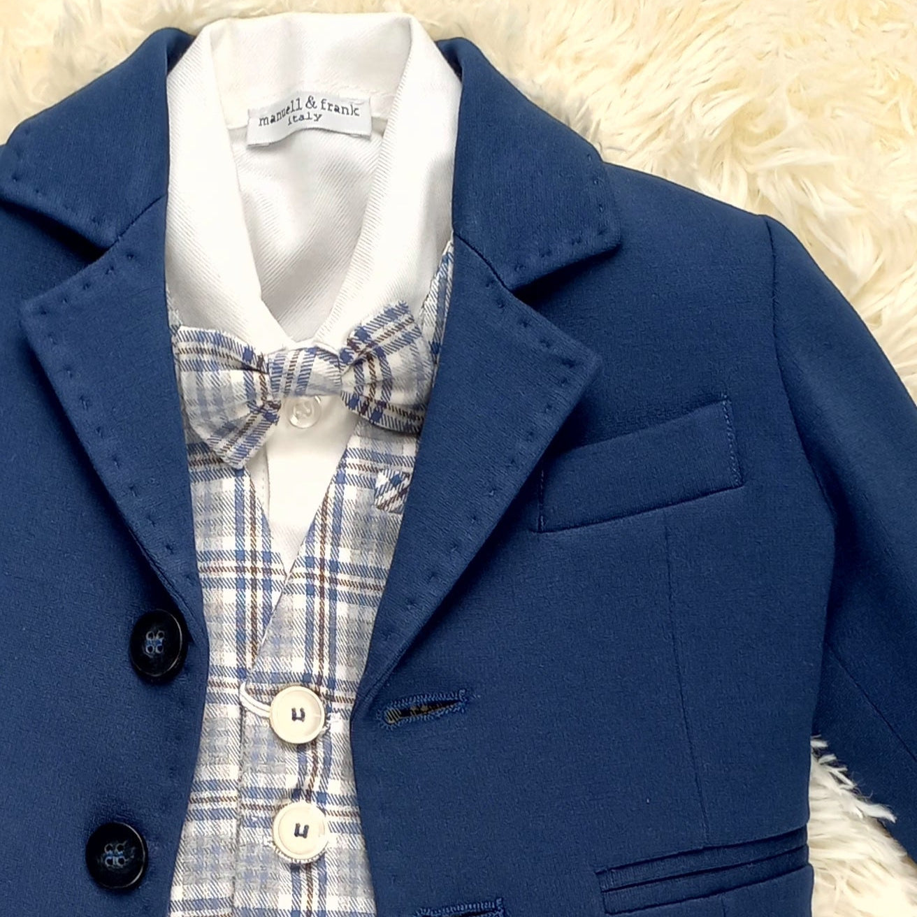 Il completo Guglielmo è un set elegante composto da cinque pezzi: una camicia in morbida flanella a body, pantaloni in punto milano con regolazione per la massima comodità, una giacca in punto milano rifinita con impunture a mano, un gilet scozzese che aggiunge un tocco di fantasia e infine un papillon abbinato perfetto per completare il look con stile. Ideale per distinguersi con classe senza rinunciare al comfort
