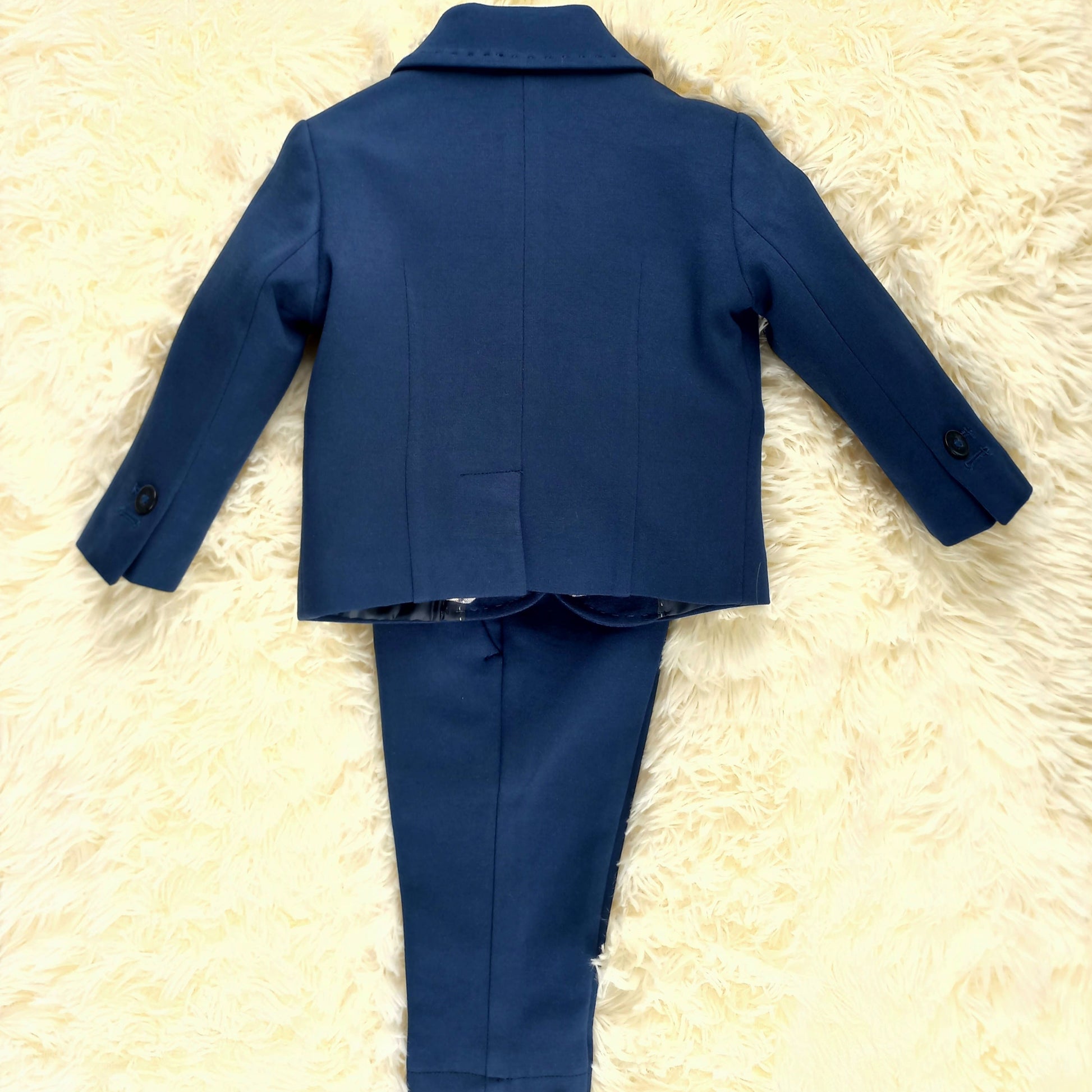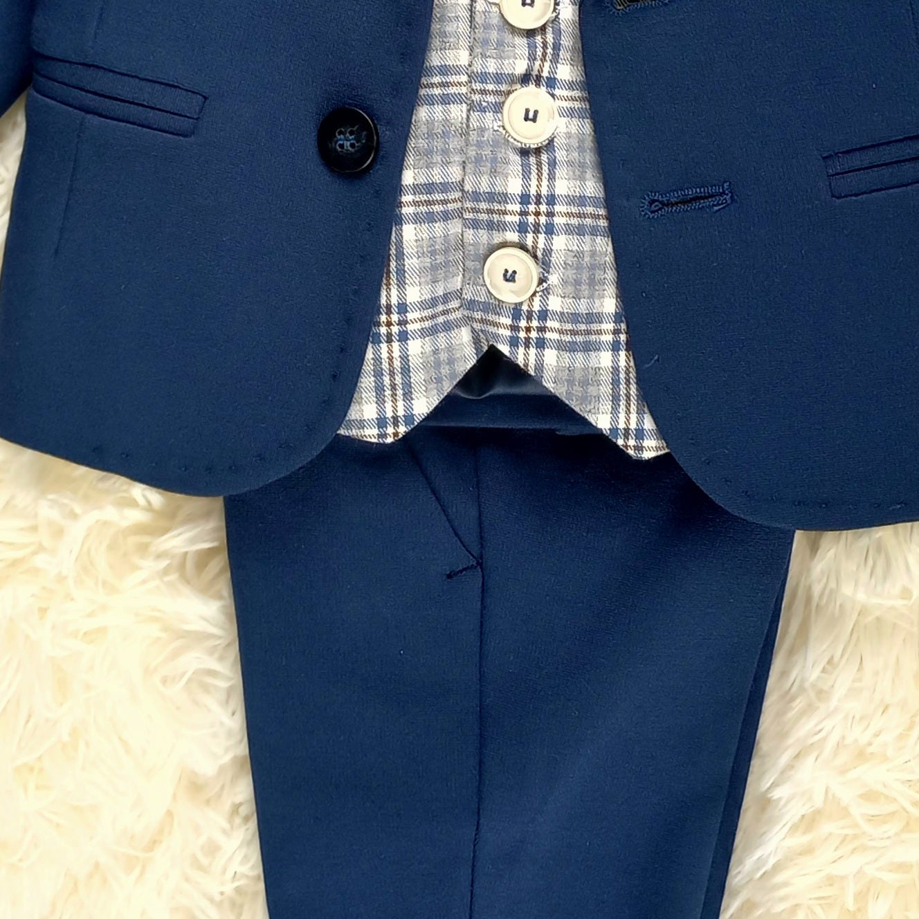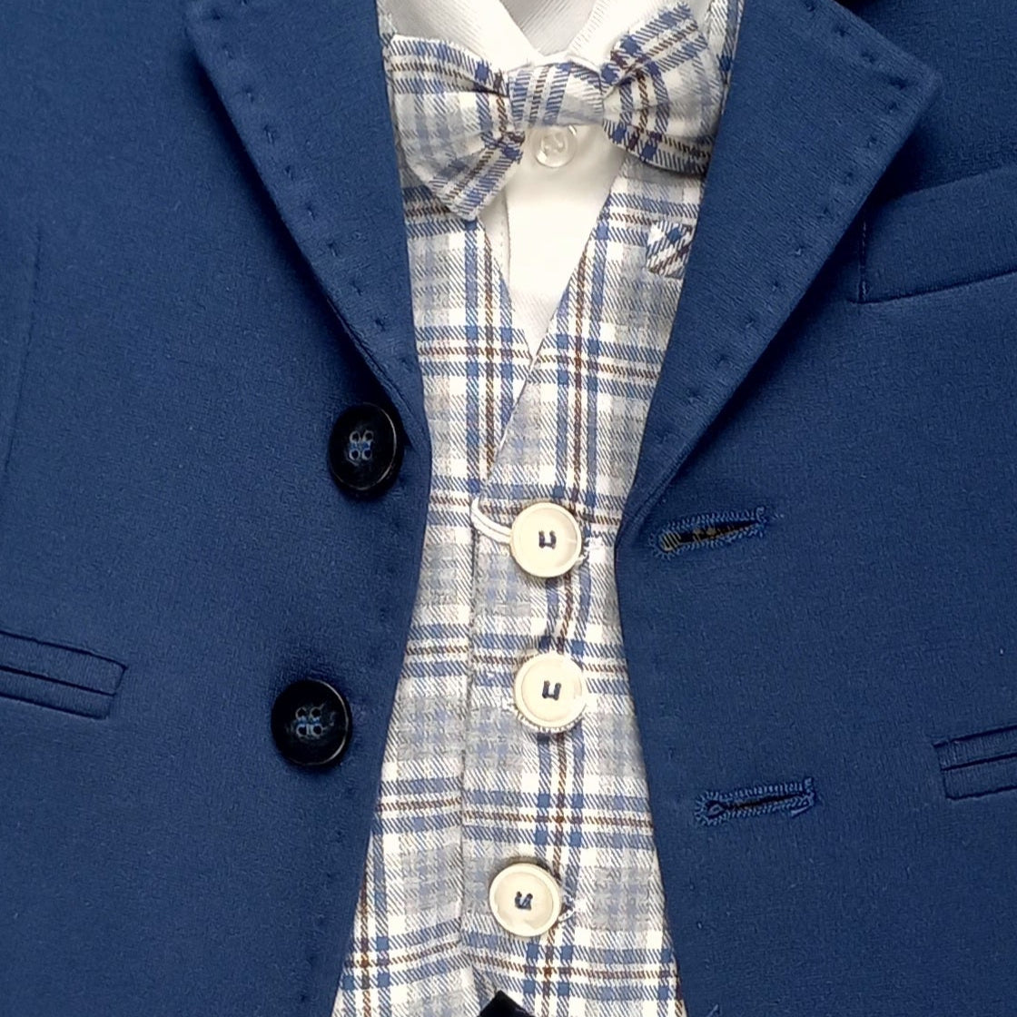 Il completo Guglielmo è un set elegante composto da cinque pezzi: una camicia in morbida flanella a body, pantaloni in punto milano con regolazione per la massima comodità, una giacca in punto milano rifinita con impunture a mano, un gilet scozzese che aggiunge un tocco di fantasia e infine un papillon abbinato perfetto per completare il look con stile. Ideale per distinguersi con classe senza rinunciare al comfort