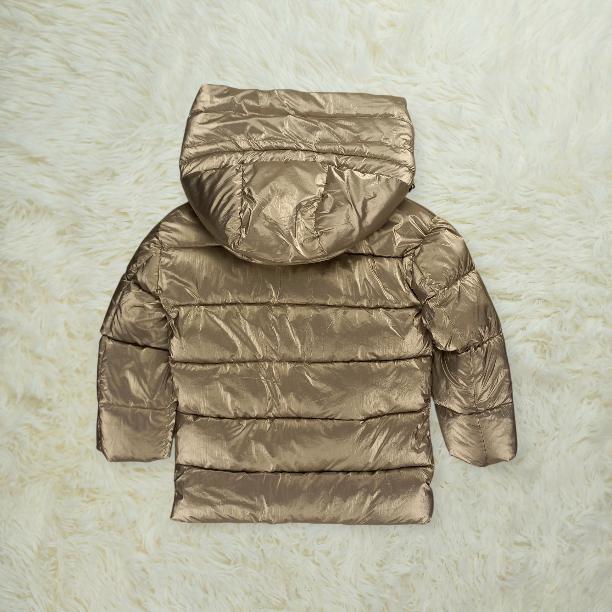 Il piumino Carla è un capospalla scintillante che trasforma ogni giornata fredda in un’occasione di stile e divertimento. Il suo colore argento-oro cangiante cattura la luce, mentre l’imbottitura sintetica lo rende leggero ma caldo come un abbraccio. Grazie ai polsini doppi e alla zip con doppio cursore, tiene fuori il freddo con praticità, e il cappuccio con elastici regolabili protegge dai capricci del tempo. Le tasche laterali donano un dettaglio comodo e super chic, perfetto per l’avventura quotidiana delle bimbe più cool!