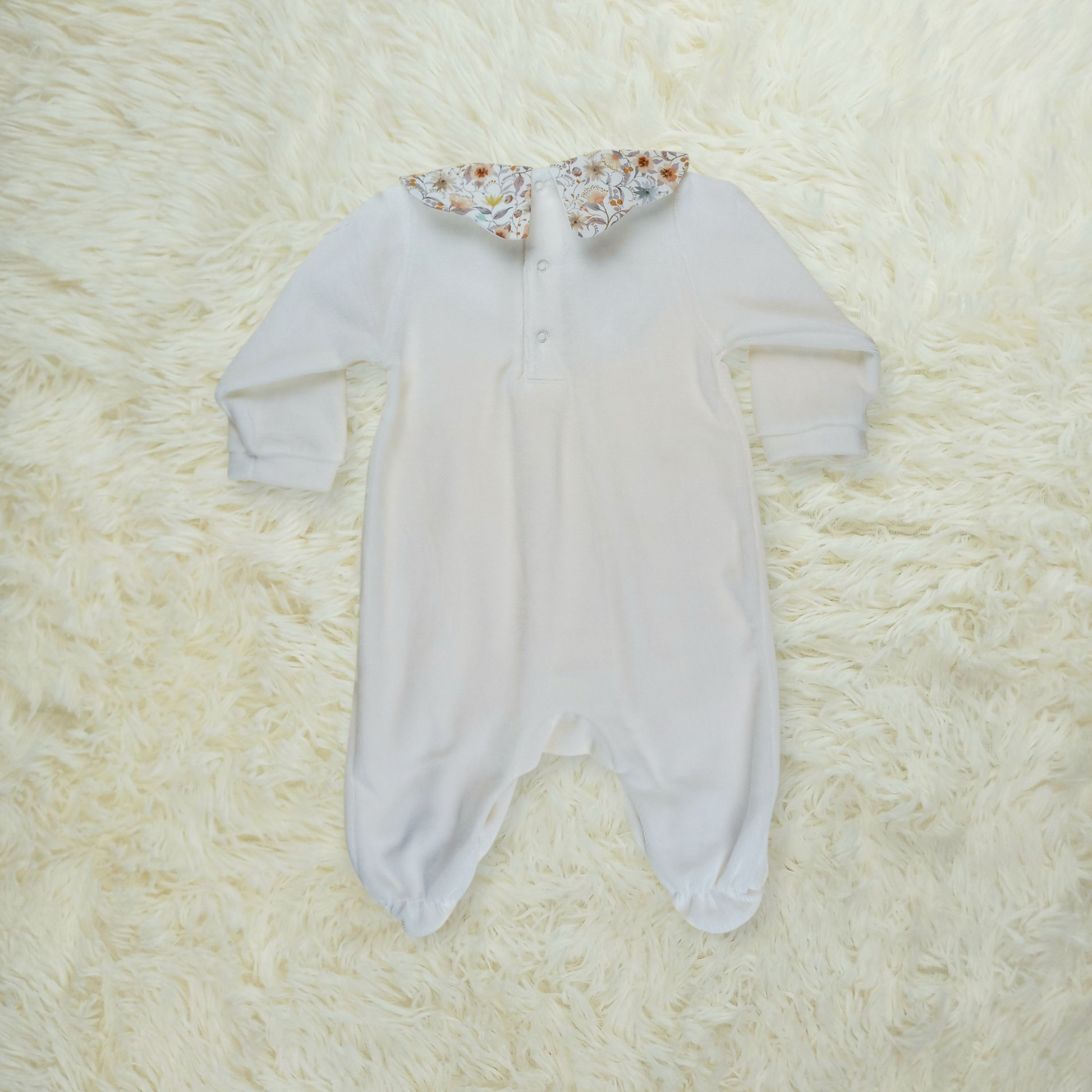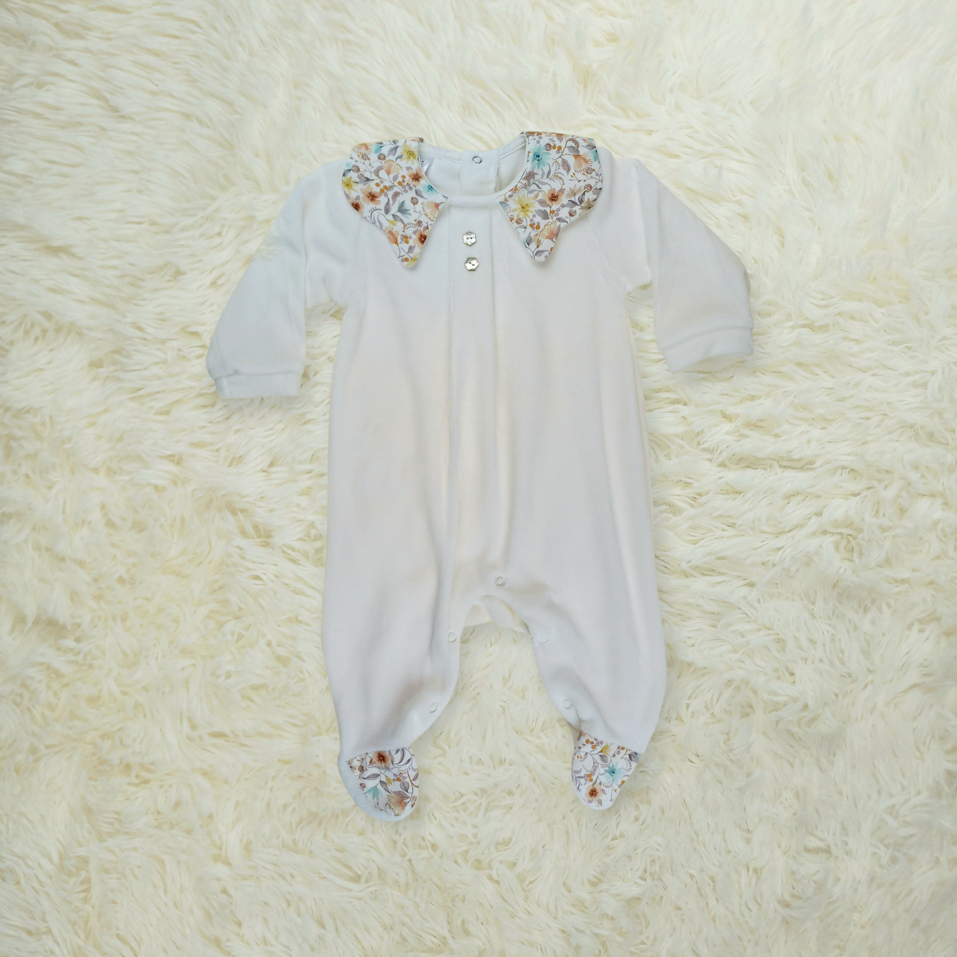 La tutina Sofia in ciniglia unisce morbidezza e stile con i piedini e il suo colletto in tessuto a fiori ei bottoncini decorativi sul davanti. L'apertura posteriore e quella tra le gambe rendono il cambio facile e veloce. Perfetto per le prime uscite.